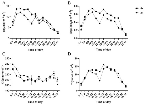 Diurnal variations in gaseous exchange of diploid and tetraploid kenaf. The data presented are mean ± SD (n = 3). (A) Net photosynthetic rate (Pn); (B) Stomatal conductance (Gs); (C) Intercellular CO2 concentration (Ci); (D) Transpiration rate (Tr).