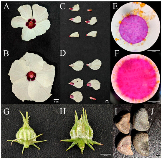 Morphological comparison of floral organs between diploid and tetraploid plants. Diploid structures (A,C,E,G,I) are consistently smaller than their tetraploid counterparts (B,D,F,H,J), demonstrating the “Gigas effect”.
