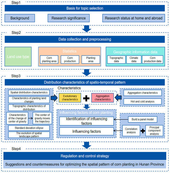 With the acceleration of urbanization in China, the contradiction between man and land has become increasingly prominent. The application of chemical fertilizers, the use of artificial irrigation, the popularization of agricultural mechanization, and the breeding of crop varieties have significantly changed the temporal and spatial layout of crop planting areas [29]. The temporal and spatial pattern of maize planting is driven by both natural and human factors. Natural factors, such as rainfall, accumulated temperature, soil properties, and topography, constitute the basic conditions for crop growth and distribution [30,31,32,33,34,35], while human factors, including the policy system, farming methods, labor force, scientific and technological level, economic development, etc., play a significant regulatory role in the evolution of planting structure and regional distribution [36,37,38,39]. To quantitatively analyze the role of driving factors, scholars use geographical detectors [40,41], geographically weighted regression [42,43], the spatial dobbin model [44], the spatial error regression model [45], the structural equation model [46], factor analysis and regression analysis [47], meta-analysis [48], DEA-TOB [49], and non-parametric test methods [50] to identify driving factors and assess their effects [51]. Therefore, considering national policies and other factors, we ask the following questions: How does the distribution pattern of maize planting in Hunan Province evolve? How should we plan the spatial layout of maize planting in this area in the future? To answer these questions, it is necessary to carry out a comprehensive study on the temporal and spatial variation characteristics of maize crop planting in this area at the regional level.