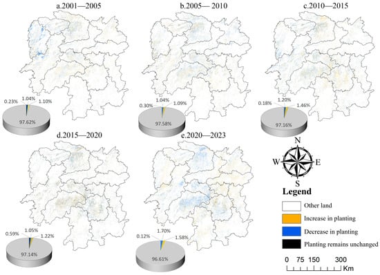 From 2001 to 2023, the maize planting area in Hunan Province showed an overall growth trend, showing a trend of first increasing and then decreasing in the time series, while in terms of spatial distribution, it showed the characteristics of gradual aggregation from northwest to east. From Figure 3, it can be seen that for the change in the maize planting area in Hunan Province, 2019 was the turning point; the maize planting area from 2000 to 2019 showed a fluctuating and upward trend, and the planting area was small. After 2019, the planting area demonstrates a downward trend, and the change in planting area has tended to be flat since 2021, indicating that the planting pattern of maize is gradually stabilizing. Overall, the planting area of maize in Hunan Province increased from 2798.34 km2 in 2001 to 3272.56 km2, an increase of 16.95%, which it peaked, with a planting area of 3988.49 km2, in 2019. This trend is consistent with the results of An Yue [57] et al.; that is, the planting area of maize in Hunan Province showed a significant increase during this period. According to Figure 4, from 2000 to 2023, the maize planting areas in the Shaoyang, Changde, Hengyang, and Huaihua cities were relatively large, indicating that the maize planting scale of these three prefecture-level cities was large.