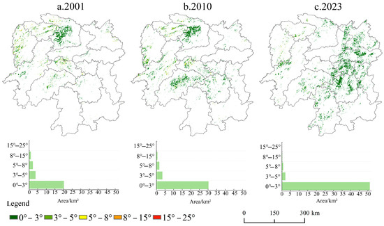 The spatial pattern of maize planting in Hunan Province has significant topographic distribution characteristics, mainly concentrated in the gentle terrain area of 0–3°, and the planting area gradually shifted to the eastern gentle area from 2001 to 2023. According to the “Soil Erosion Classification and Grading Standard” (SL 190-2007), the slope is divided into five grades: 0–3°, 3–5°, 5–8°, 8–15°, and 15–25°. The spatial distribution analysis based on Figure 6 shows that the spatial distribution of maize planting in Hunan Province has significant topographic selectivity characteristics, which is mainly concentrated in the gentle terrain area of 0–3°. From the perspective of time series, maize planting in 2001 and 2005 was mainly distributed in the northern and central terrain slopes of Hunan Province. In 2023, the spatial distribution pattern of maize planting will change, showing a trend of shifting to the gentle areas of eastern Hunan Province. It is worth noting that in the slope range of 8–25°, maize planting showed sporadic distribution characteristics.