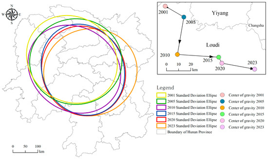 Standard deviation ellipse and center of gravity shift in maize planting in Hunan Province, 2001–2023.