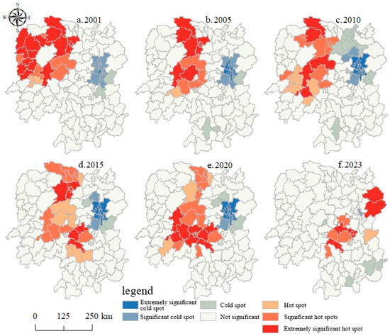 Characterization of spatial cold and hot spots of maize cultivation in Hunan Province, 2001–2023.