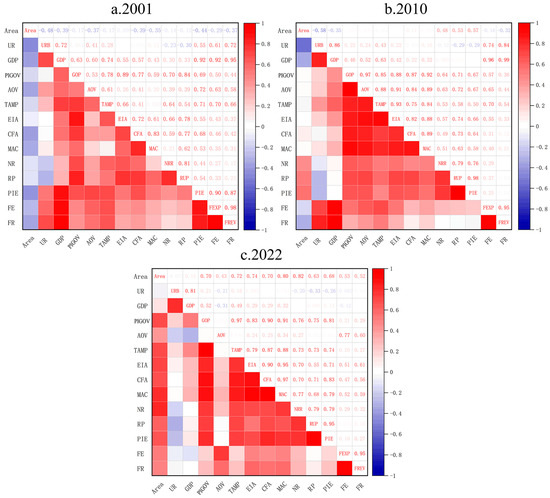 From the load coefficient in Table 4, the first principal component is mainly reflected in agricultural production conditions such as MCA and EIA, and the influence of agricultural production conditions is increasing year by year. For example, the load coefficient of the mechanized cultivation area increased significantly, and the load coefficient in 2001 was only 0.60, which indicated that the influence of agricultural production conditions in 2001 was weak, and the agricultural production conditions at that time had a limited role in promoting maize planting. It continued to increase to 0.98 in 2022, indicating that the continuous strengthening of agricultural production conditions has become a key factor for the growth of the maize planting area in Hunan Province. At the same time, the load coefficient of the TAMP remained at a high level. In terms of water conservancy facilities, the load coefficient of the NR increased from 0.62 to 0.83 in 2022, and the load coefficient of the EIA increased, all of which showed that the construction and improvement in farmland water conservancy facilities played a continuing role in promoting maize planting. These changes show that the continuous improvement in agricultural infrastructure, the rapid improvement in agricultural mechanization, and the development of water conservancy facilities play an important role in expanding the planting area of maize from 2001 to 2022.