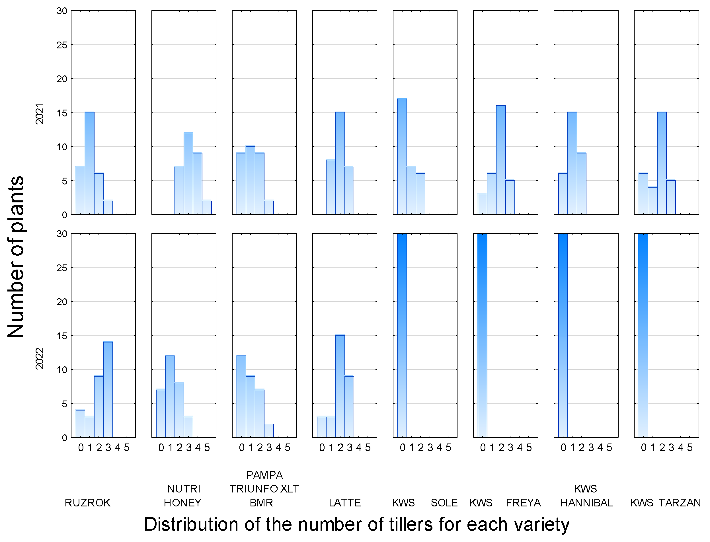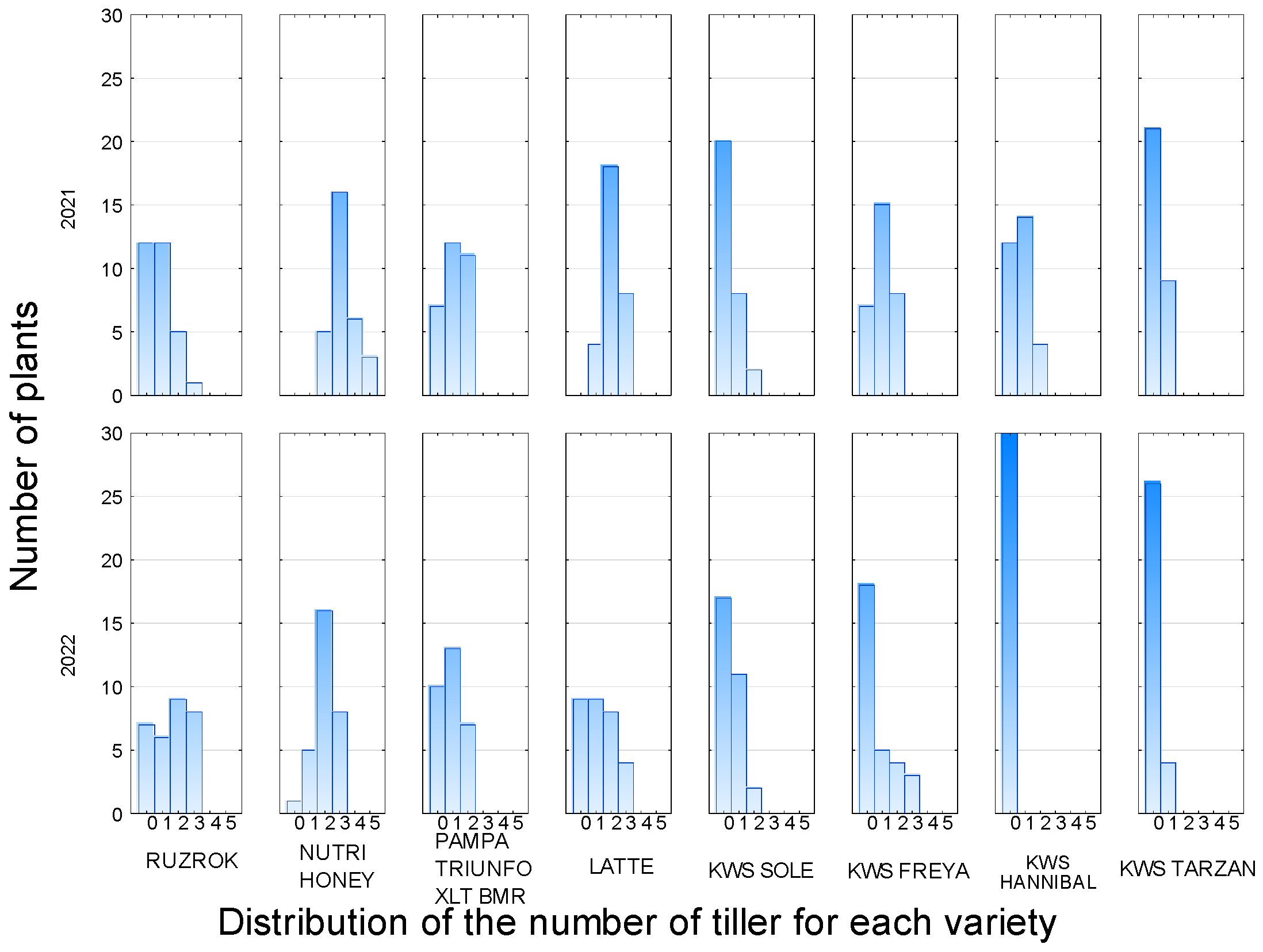 Variety | Distribution of Tillers Occurrence (%) | |||