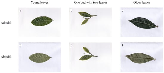 Scanned images of tea leaves showing different views and developmental stages: (a) Adaxial view of young leaves, (b) Adaxial view of one bud with two leaves, (c) Adaxial view of older leaves, (d) Abaxial view of young leaves, (e) Abaxial view of one bud with two leaves, (f) Abaxial view of older leaves. This figure highlights the variations in appearance across different physiological ages and leaf surfaces.