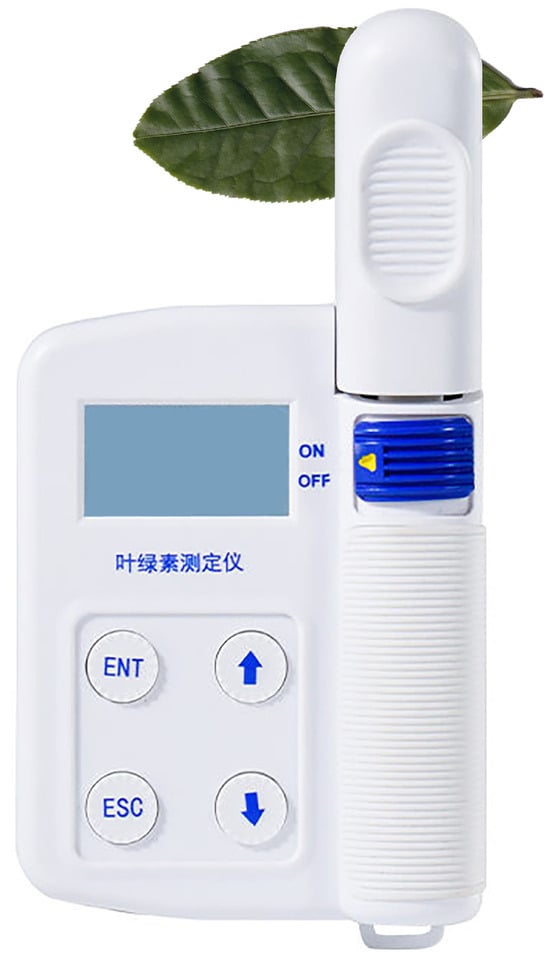 In this study, chlorophyll and nitrogen contents of tea leaves were measured using a portable chlorophyll and nitrogen analyzer (Model: HM-YC, HENGMEI Intelligent Manufacturing). As shown in Figure 3, this device enables non-destructive and rapid estimation of chlorophyll levels through the SPAD index [26]. The SPAD value is derived from the transmittance ratio of light passing through the leaf at two wavelengths: 650 nm, which corresponds to chlorophyll absorption, and 940 nm, which serves as the reference. By comparing transmittance at these wavelengths, the analyzer estimates relative chlorophyll content. Because SPAD values are positively correlated with actual chlorophyll concentrations, they are widely used in agricultural research and practice as reliable indirect indicators of chlorophyll levels and overall plant health.