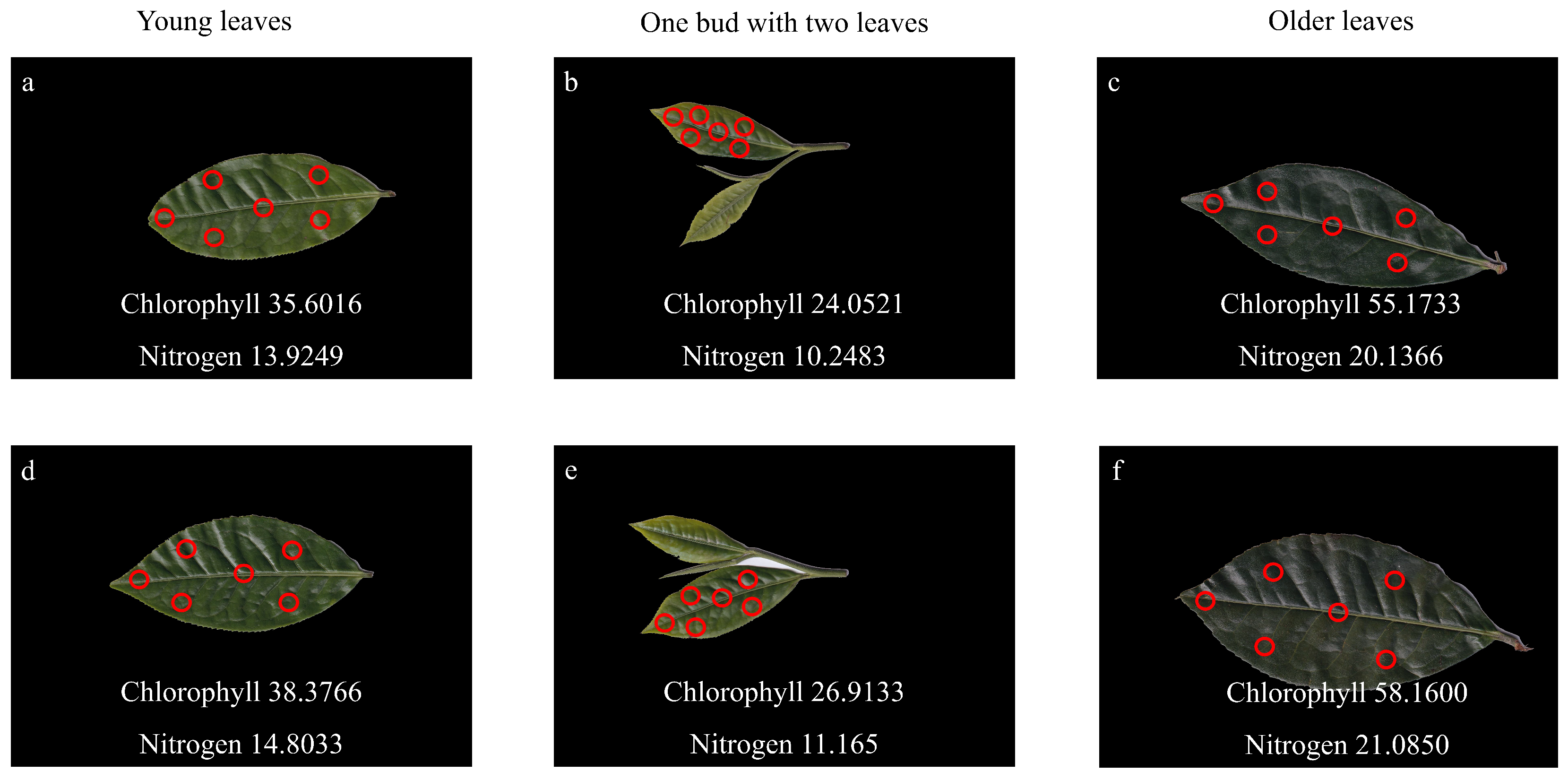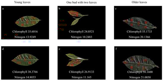 Six-point sampling method for chlorophyll and nitrogen content measurement in tea leaves at different developmental stages. The upper row (a–c) shows the adaxial leaf surfaces, and the lower row (d–f) shows the abaxial surfaces. Red circles indicate the sampling regions used for chlorophyll and nitrogen measurement. (a,d) Young leaves; (b,e) One bud with two leaves; (c,f) Older leaves.