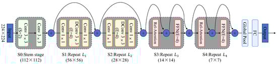 Stage S1 consists of repeated blocks, each comprising a 1 × 1 convolution, a depthwise convolution with a 4× expansion ratio, and a final 1 × 1 convolution. This design strengthens local feature representation while maintaining computational efficiency. In Stage S2, the spatial resolution is further reduced to 28 × 28, and the network applies repeated blocks with increased channel capacity, enabling extraction of more complex and abstract features.