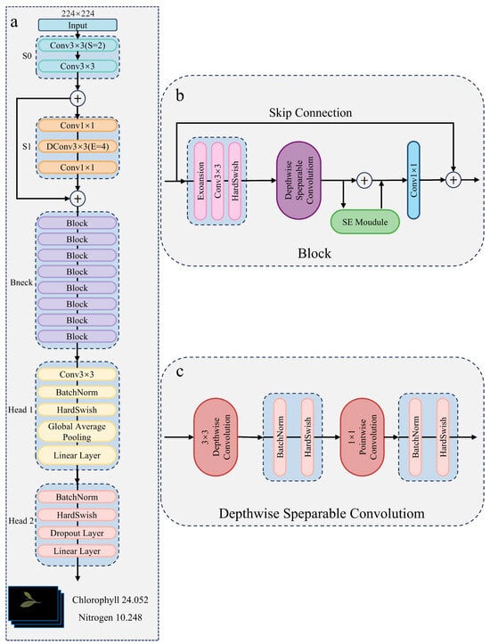 Although CoAtNet achieves strong performance across vision tasks through its hybrid integration of convolution and attention mechanisms, its high computational cost and large parameter count, particularly in the attention-heavy stages (S3 and S4), limit its suitability for real-time, resource-constrained applications such as mobile or edge-based tea leaf assessment. To overcome these challenges, we propose an improved CoAtNet-based architecture that significantly reduces model size while preserving predictive accuracy. As illustrated in Figure 6a, the redesigned framework retains the early convolutional stages (S0 and S1) for efficient low-level feature extraction, while replacing the later attention modules with lightweight Bneck blocks inspired by MobileNetV3 [28]. Each Bneck block incorporates an expansion layer, depthwise separable convolution, a Squeeze-and-Excitation (SE) module [29], and the h-swish activation function in place of GELU. This design, consistent with MobileNetV3 principles, achieves substantial computational efficiency and enables deployment on mobile and edge devices, as depicted in Figure 6b,c.