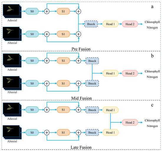 Three fusion strategies for integrating adaxial and abaxial images were evaluated: Pre-fusion (integration after the stem module), Mid-fusion (integration after the per-branch Bneck blocks), and Late-fusion (integration at the prediction/output level).