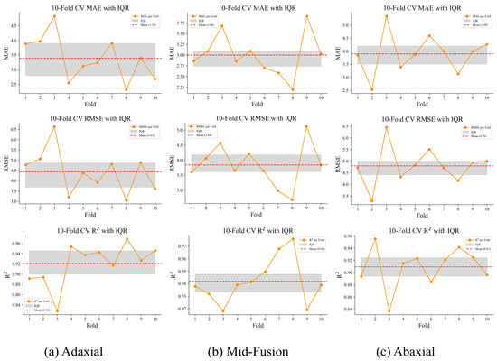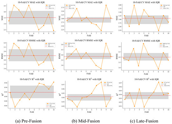To further illustrate variability and agreement across folds, additional visual analyses were conducted. Figure 8 presents fold-wise , , and values along with their corresponding interquartile ranges (IQR). The Mid-fusion strategy achieves the lowest mean errors and the narrowest IQR, demonstrating consistent performance across folds. In contrast, Pre-fusion exhibits the widest IQR and larger fluctuations, while Late-fusion falls in between, with errors close to Mid-fusion but slightly less stable.