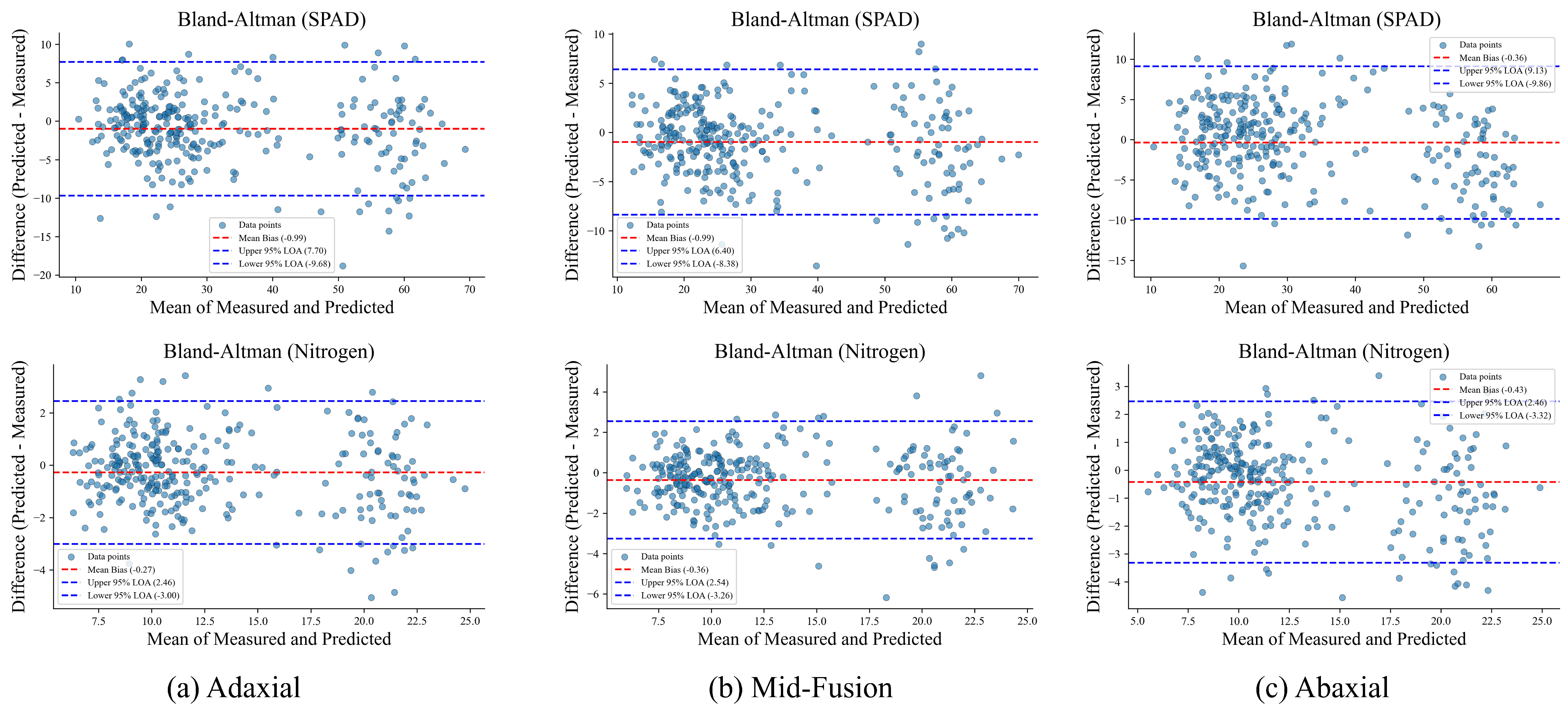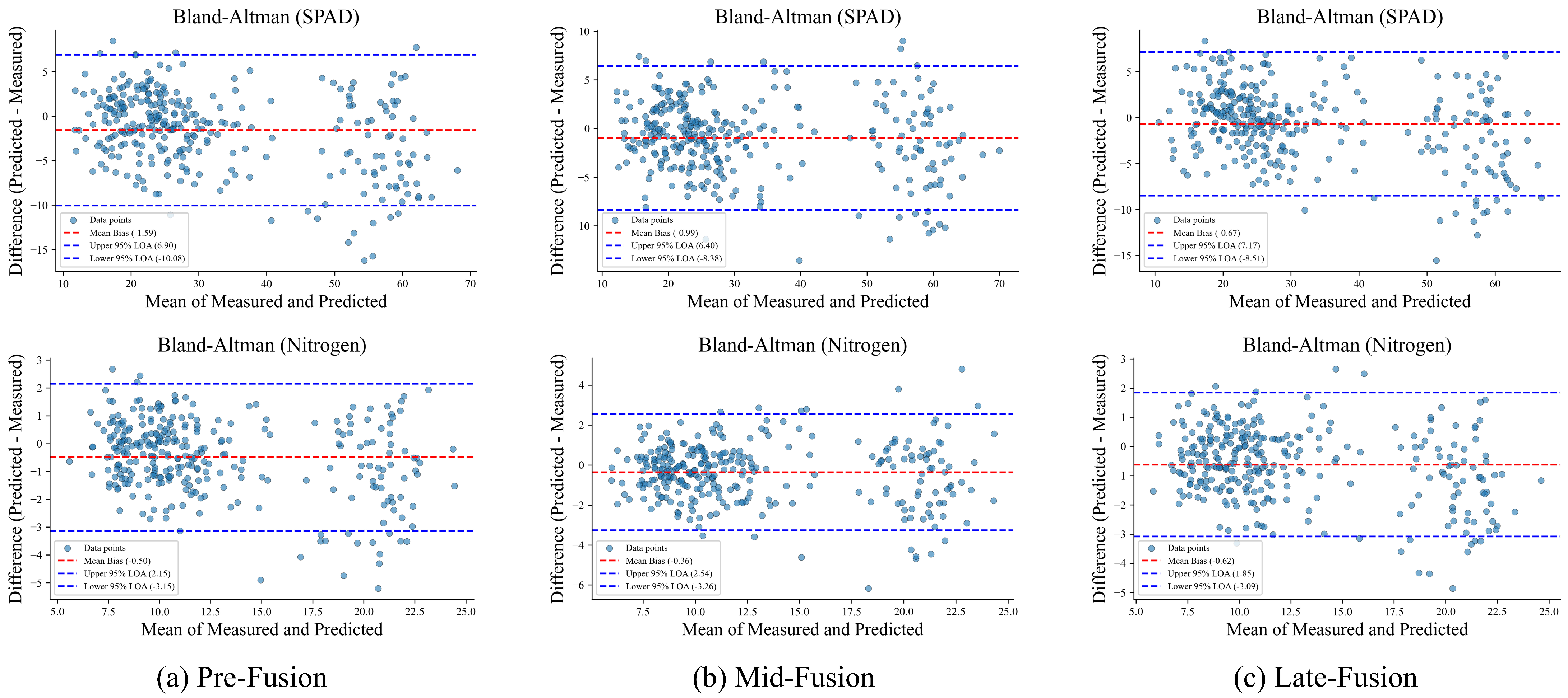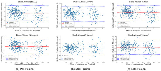 Bland–Altman analysis of predicted versus measured values for SPAD and nitrogen content under different fusion strategies. The red dashed line denotes the mean bias, while the blue dashed lines mark the 95% LOA. Mid-fusion shows the smallest bias and narrowest LOA, confirming its superior predictive agreement.