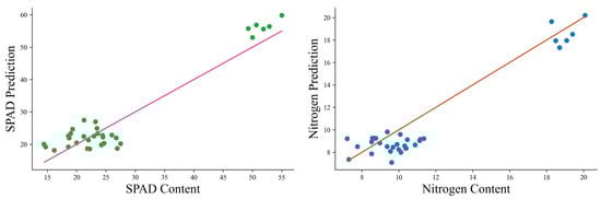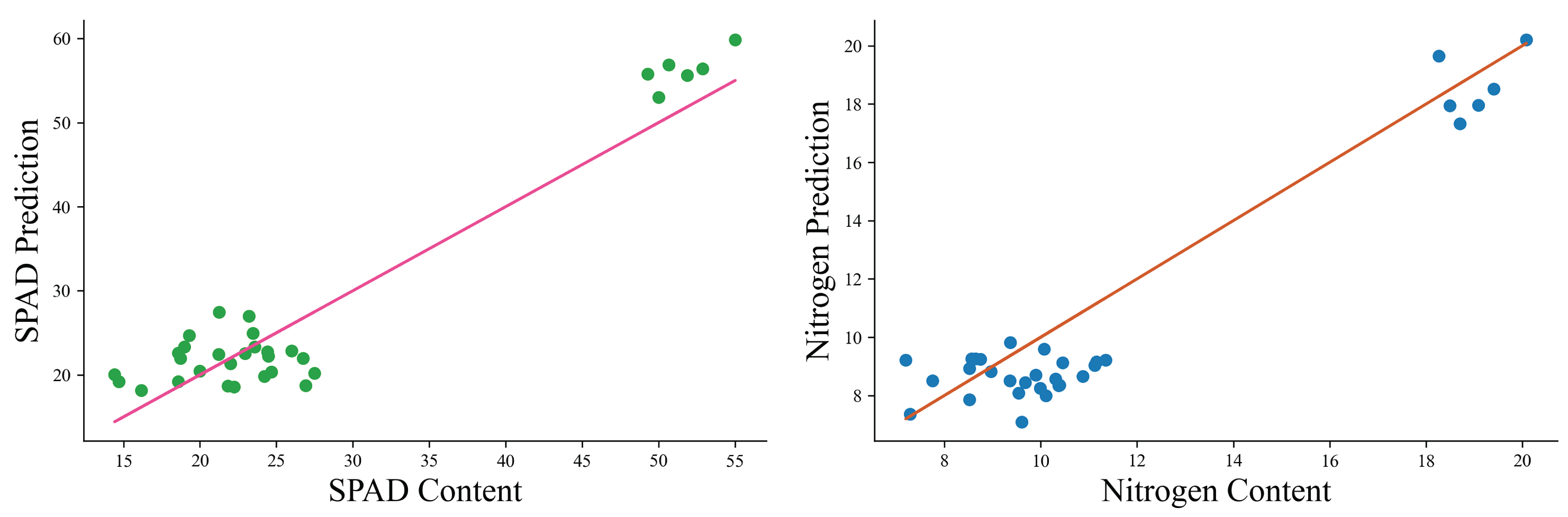 Prediction results of the dual-view RGB model on the mixed-device test set. The red line represents the perfect fit (true values), while scatter points correspond to model predictions for SPAD and nitrogen contents.