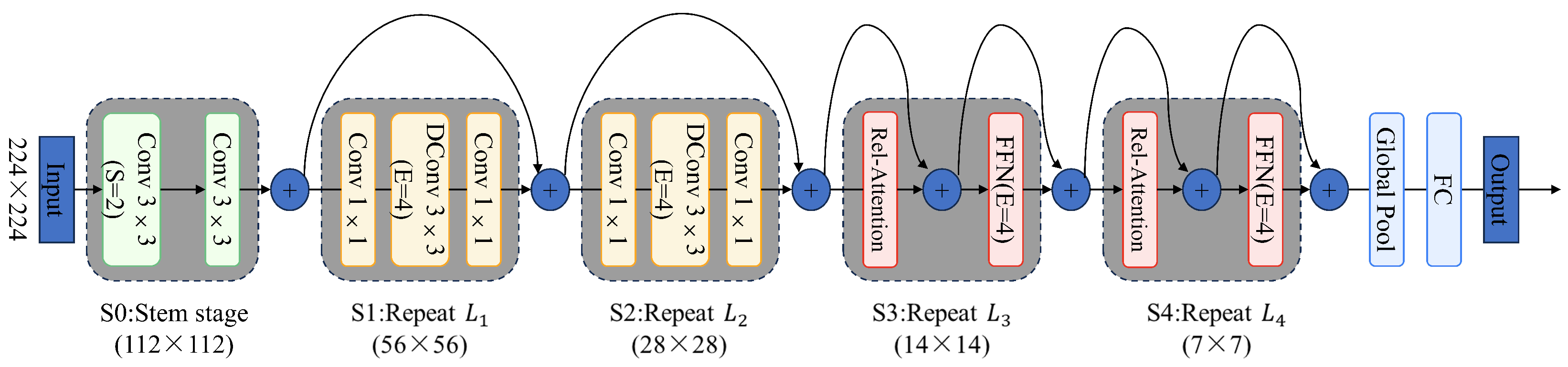 The diagram presents the complete network structure from the input layer to the output layer, encompassing convolutional stages (S0 to S1) and attention stages (S2 to S4). Notably, it demonstrates how the integration of depthwise convolution with relative attention mechanisms effectively captures local features and global contextual information, thereby achieving robust processing capabilities across various data scales.