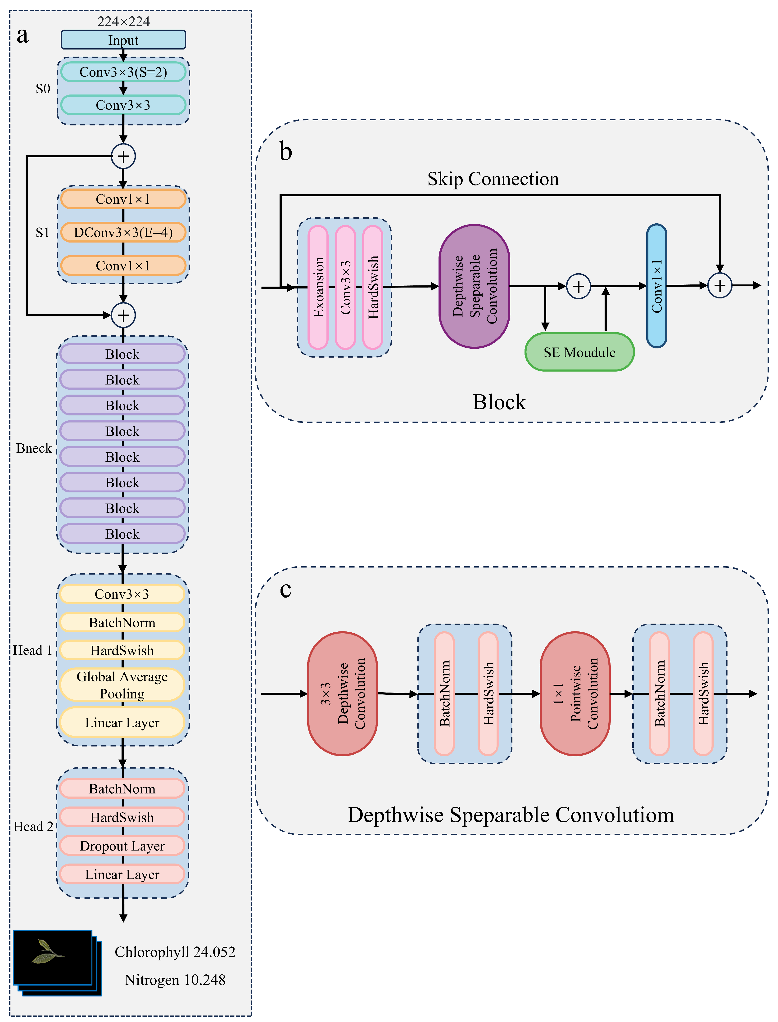 (a) Overall structure of the improved CoAtNet-based model. (b) Internal design of the MobileNetV3-inspired Bneck block. (c) Structure of the depthwise separable convolution used in Bneck blocks.
