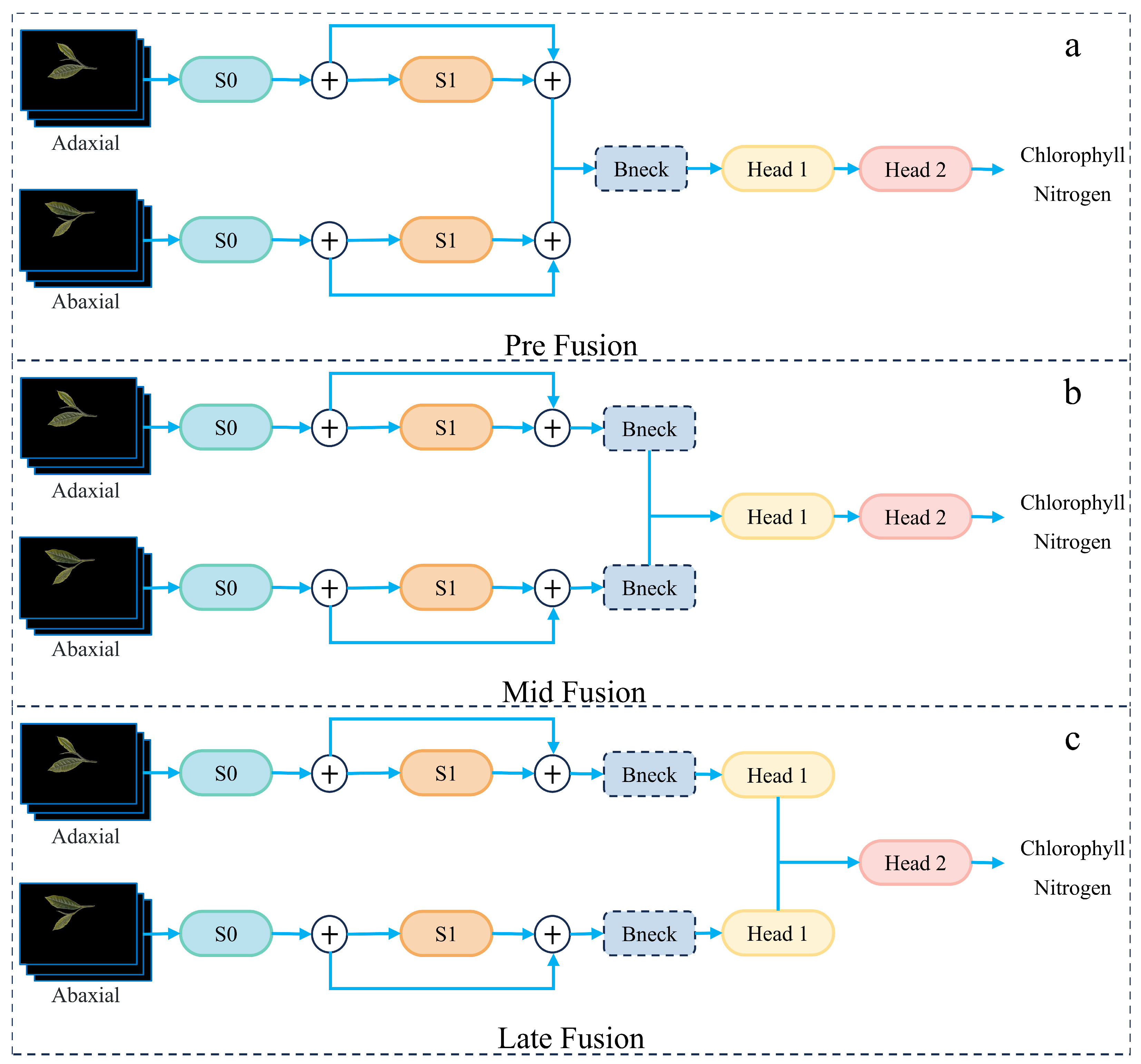 Comparison of the three fusion strategies: (a) Pre-fusion after S1, (b) Mid-fusion after Bneck, and (c) Late-fusion after the prediction heads.