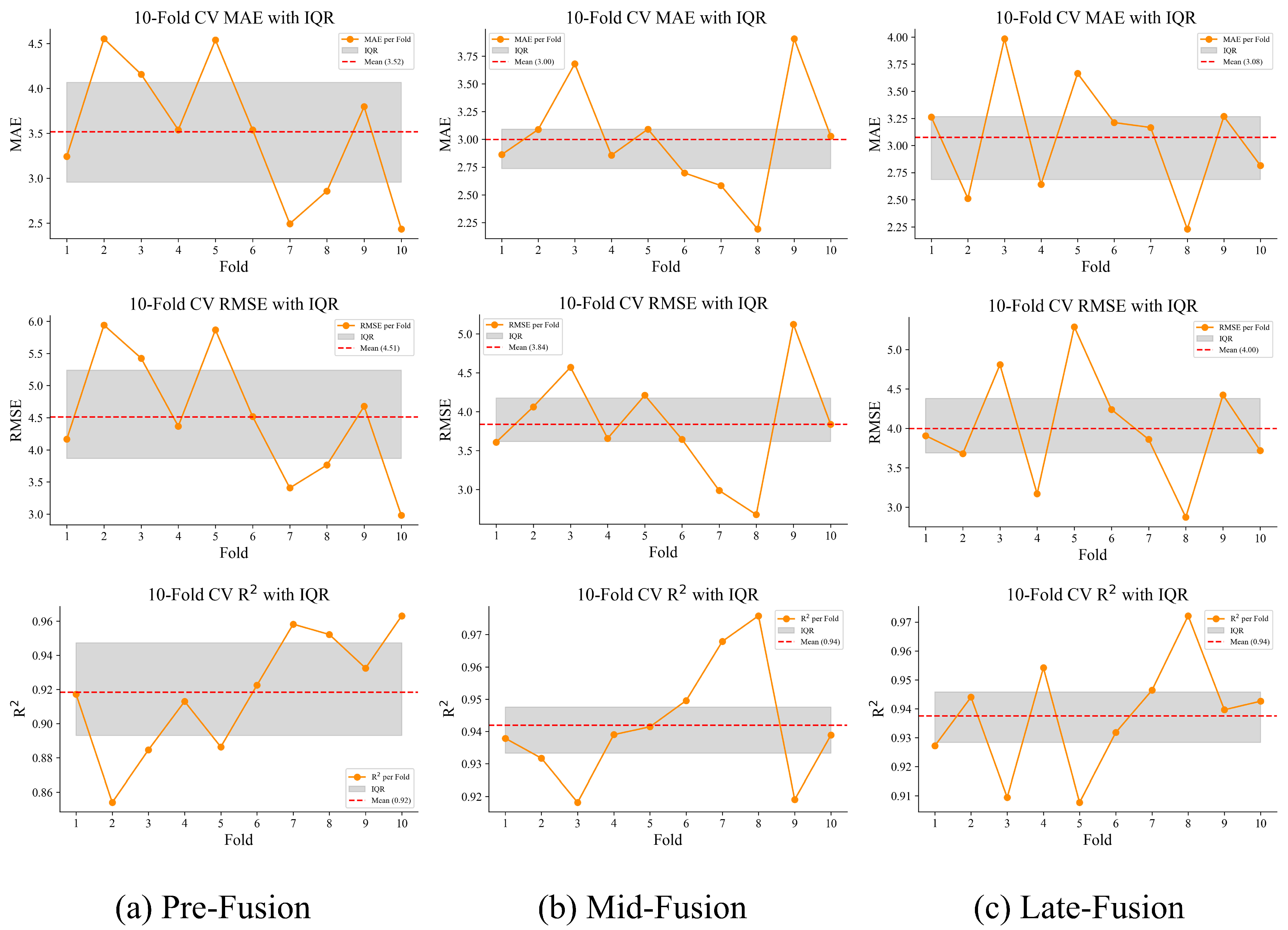 Distribution of ten-fold cross-validation metrics (, , and ) for Pre-, Mid-, and Late-fusion strategies. The orange lines denote fold-wise metric values, the gray shaded areas represent the IQR, and the red dashed lines indicate mean values across folds. Mid-fusion demonstrates the narrowest IQR and the lowest error metrics, underscoring its stability and robustness.