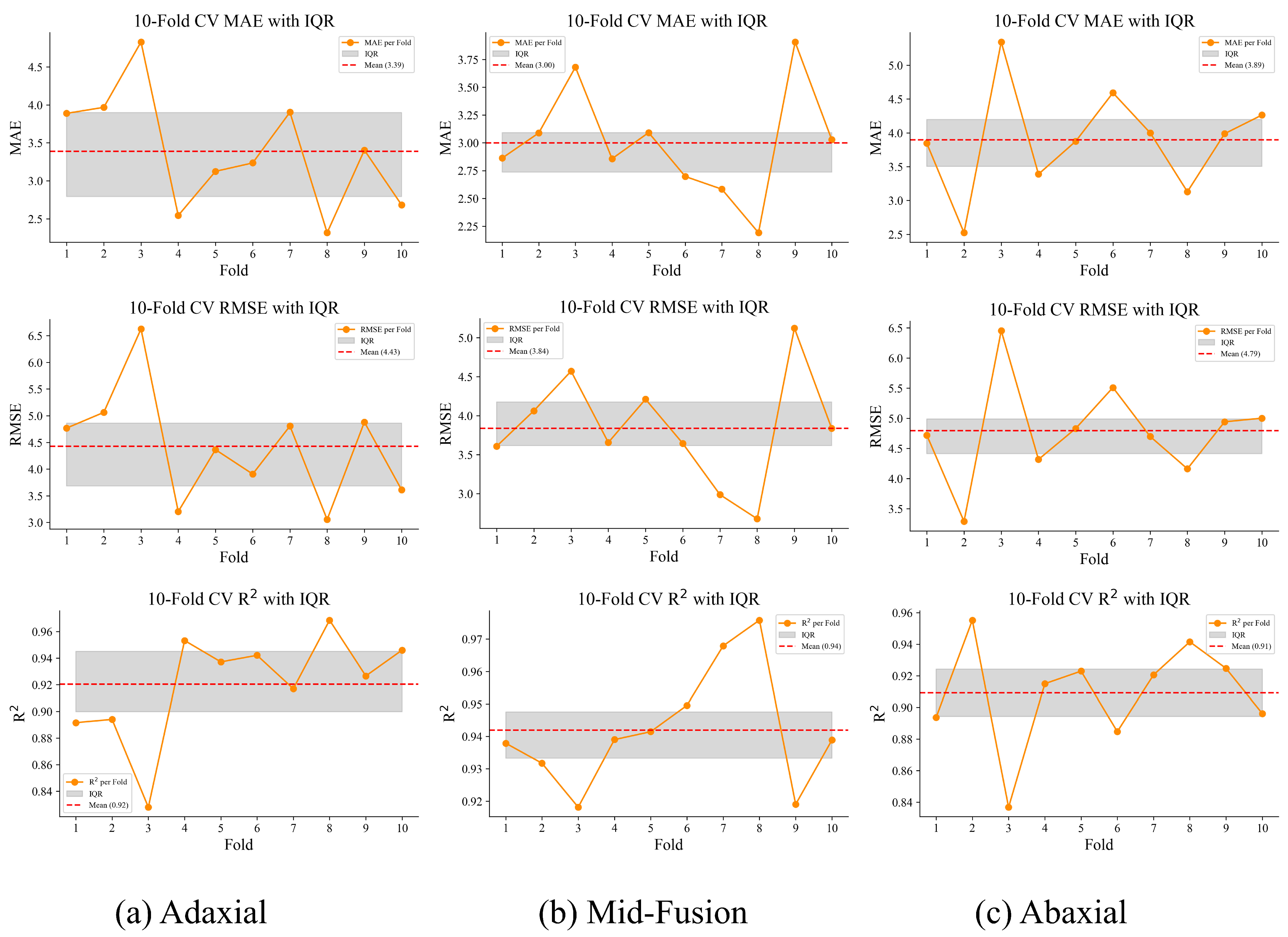Ten-fold cross-validation per fold with IQR for adaxial, Mid-fusion, and abaxial inputs. The orange lines indicate per fold, gray shaded areas represent the IQR, and the red dashed lines denote the mean .