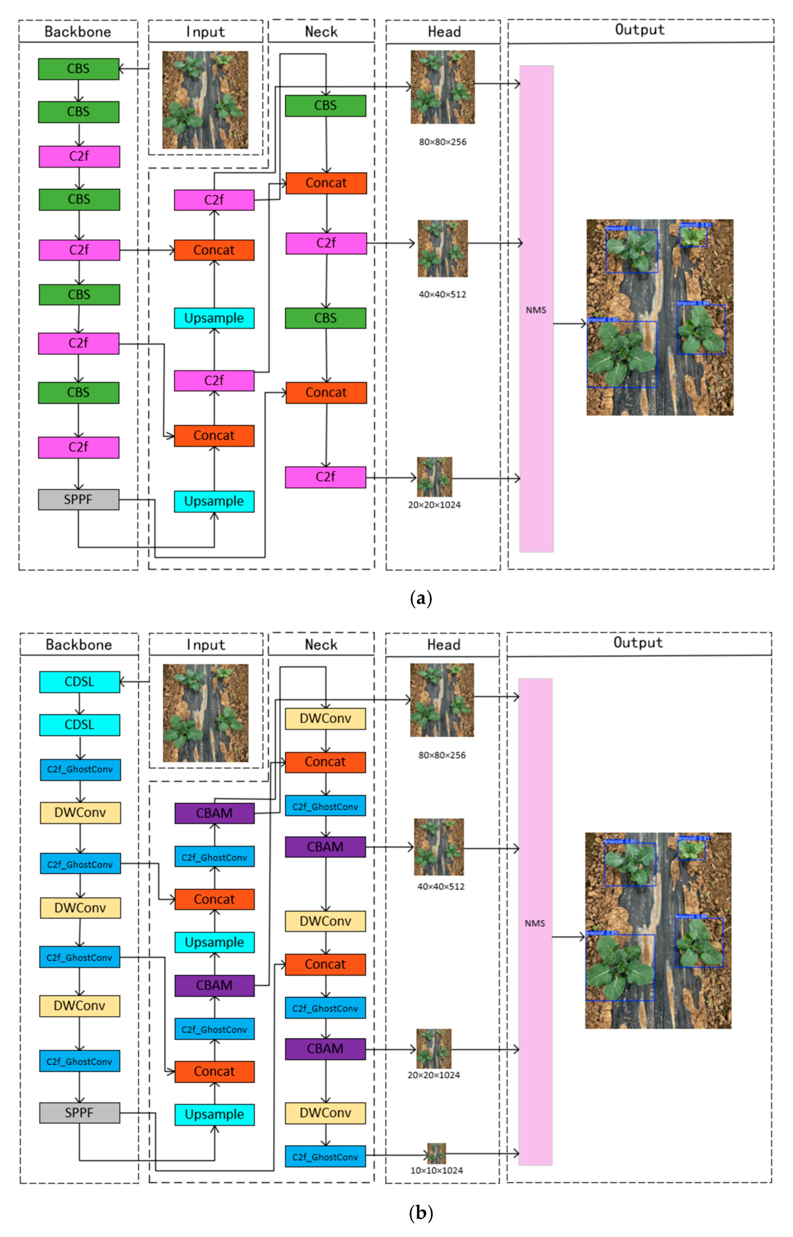 13] addressed the need for potato seed tuber detection and proposed the DCS-YOLOv5s model. This model utilized DP_Conv to replace standard CBS convolution, reducing the number of parameters, and introduced Ghost convolution into the C3 module to decrease redundant features, achieving overall model lightweighting. Experiments showed that DCS-YOLOv5s achieved an mAP of 97.1%, a frame rate of 65 FPS, and a computational cost of only 10.7 GFLOPs, reducing computation by 33.1% compared to YOLOv5s. Tang et al. [