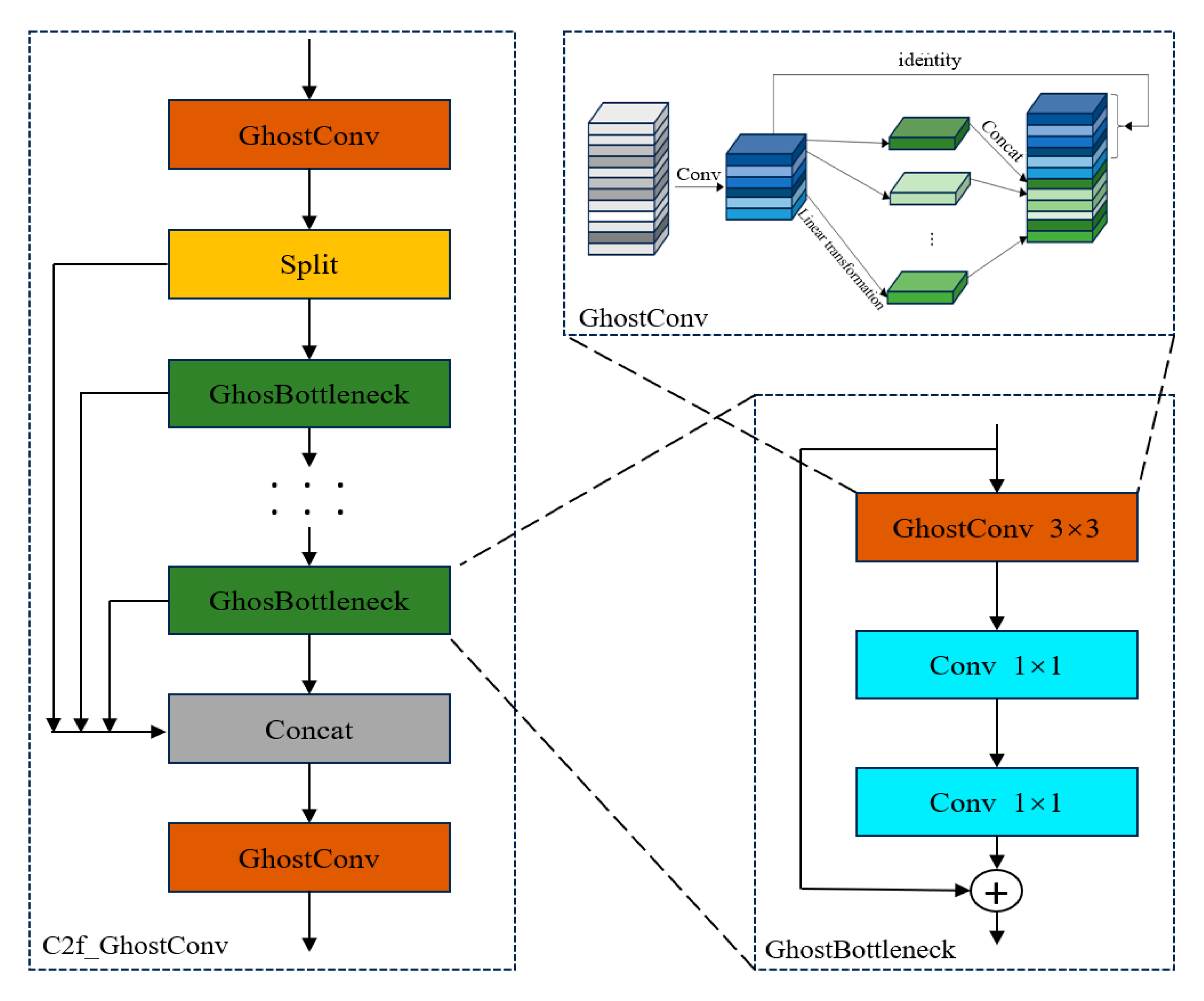 21] is introduced into the C2f module to form a C2f-GhostConv module, which helps reduce computational cost and the number of parameters while improving detection speed. Secondly, a CDSL module is designed to enhance the model’s ability to extract features from original images. The CBAM [
