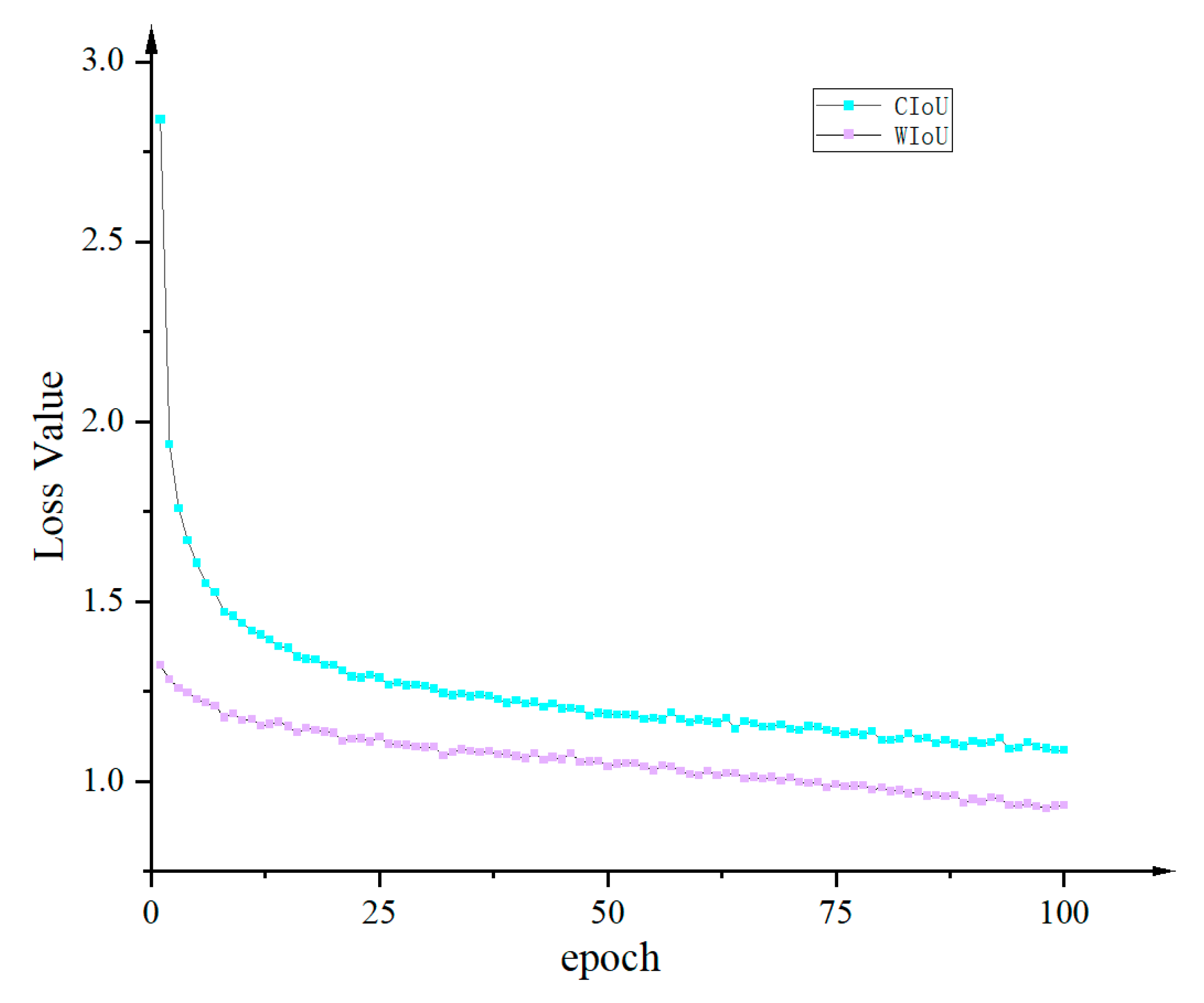 Figure 9 shows the loss comparison between the model from Experiment 1 (CIoU) and Experiment 4 (WIoU) over 100 epochs. Analysis shows that replacing the CIoU loss function with WIoU accelerated the model’s convergence speed and reduced the loss value. When using CIoU, the loss decreased at a slower rate after the 75th epoch and dropping from 2.84 to 1.13, with a final loss value of about 1.08 at convergence. In contrast, the WIoU loss function reached convergence around the 50th iteration, dropping from 1.32 to 1.03, and stabilized around 0.8 at final convergence.