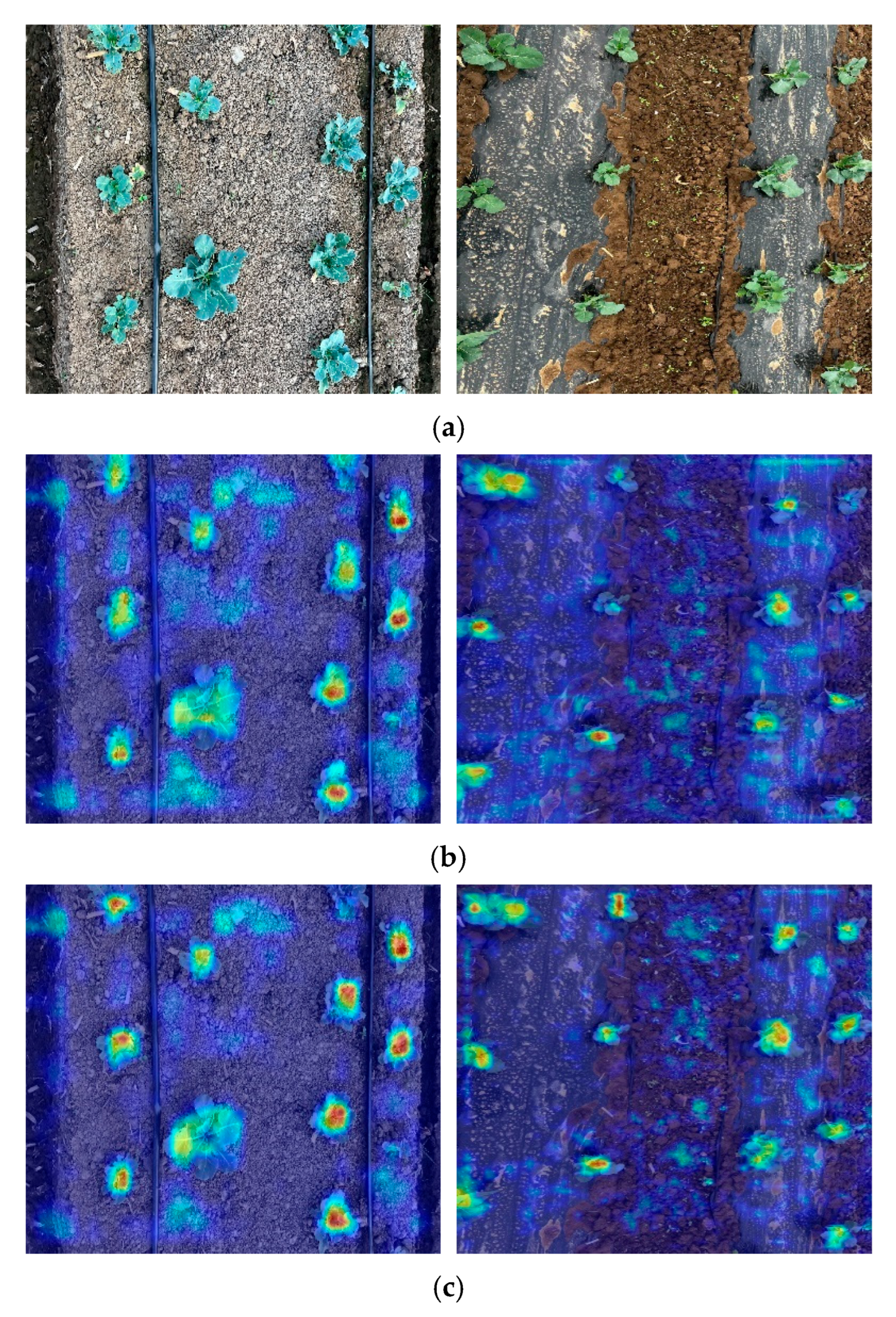 Figure 11c is brighter and has higher coverage, while the brightness of incorrectly detected areas is reduced. The CBAM attention mechanism enhances the model’s feature extraction capability and provides a more complete extraction of target feature information. It increases the model’s attention to channel and spatial information, enhances perception of the correct target, and suppresses the impact of non-target regions on the overall predictive performance.