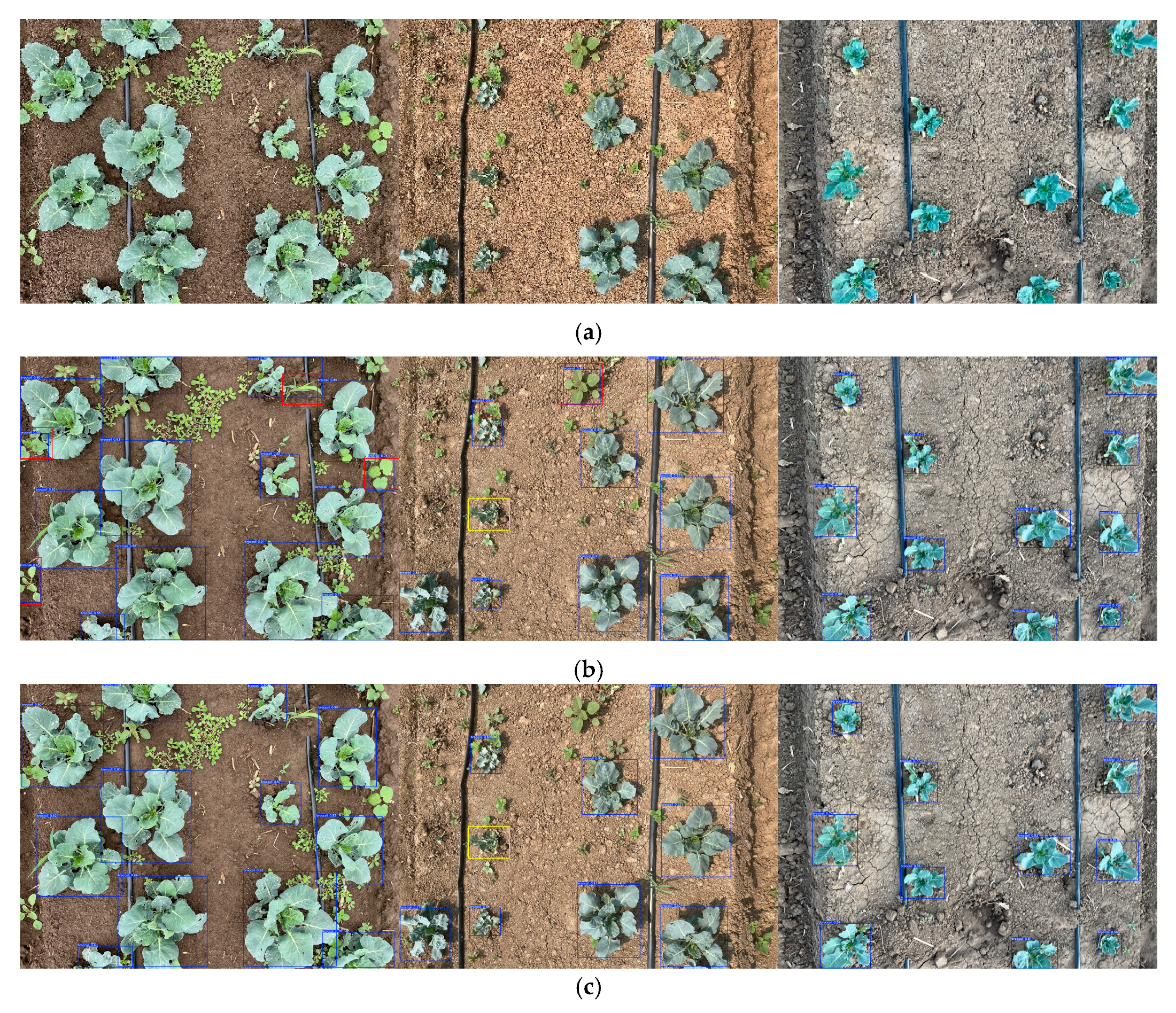Figure 12. The figure shows that YOLOv8s is prone to missed detections in complex environments and, when weeds are abundant, often misidentifies weeds as