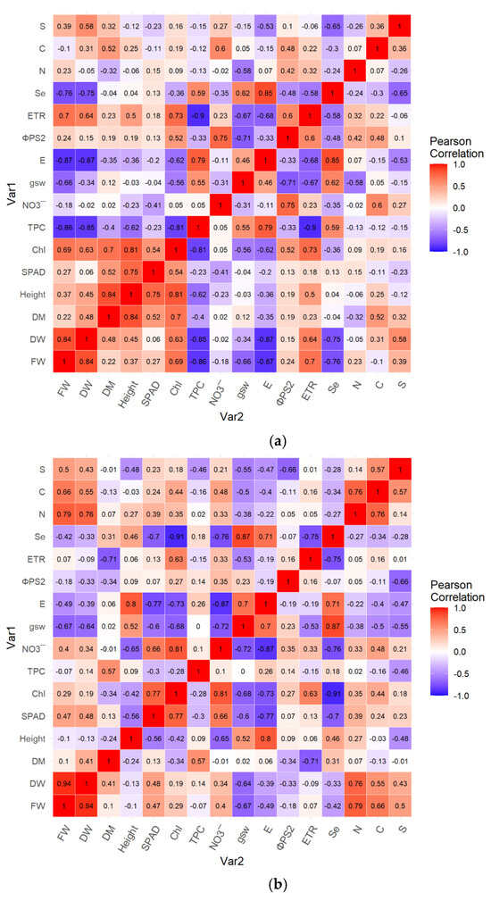 Pearson’s correlation coefficients among measured traits in basil subjected to Se biofortification: ‘Fine Verde’ (a) and ‘Red Rubin’ (b). The colour scale ranges from −1 (strong negative correlation, blue) to +1 (strong positive correlation, red). Traits: yield (FW), dry weight, dry matter percentage, plant height, SPAD index (SPAD), chlorophyll (Chl), total phenol content (TPC), nitrate (NO3−), stomatal conductance (gsw), transpiration rate (E), effective quantum yield of PSII (ΦPSII), electron transport rate (ETR), selenium (Se), nitrogen (N), carbon (C), and sulphur (S). Correlations were based on n = 10 observations (df = 8).
