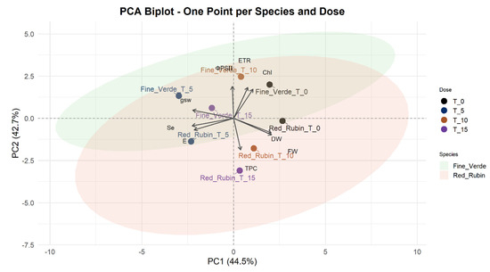 Principal Component Analysis (PCA) was performed to explore the multivariate distribution of morphological and physiological traits in both basil cultivars under Se biofortification. DM, plant height, SPAD, C, and S were not included in the PCA because, after evaluating sampling adequacy with the Kaiser-Meyer-Olkin (KMO) test, each of these variables yielded a value < 0.50, indicating that they were not suitable for reliably explaining the variance between the FV and RR.