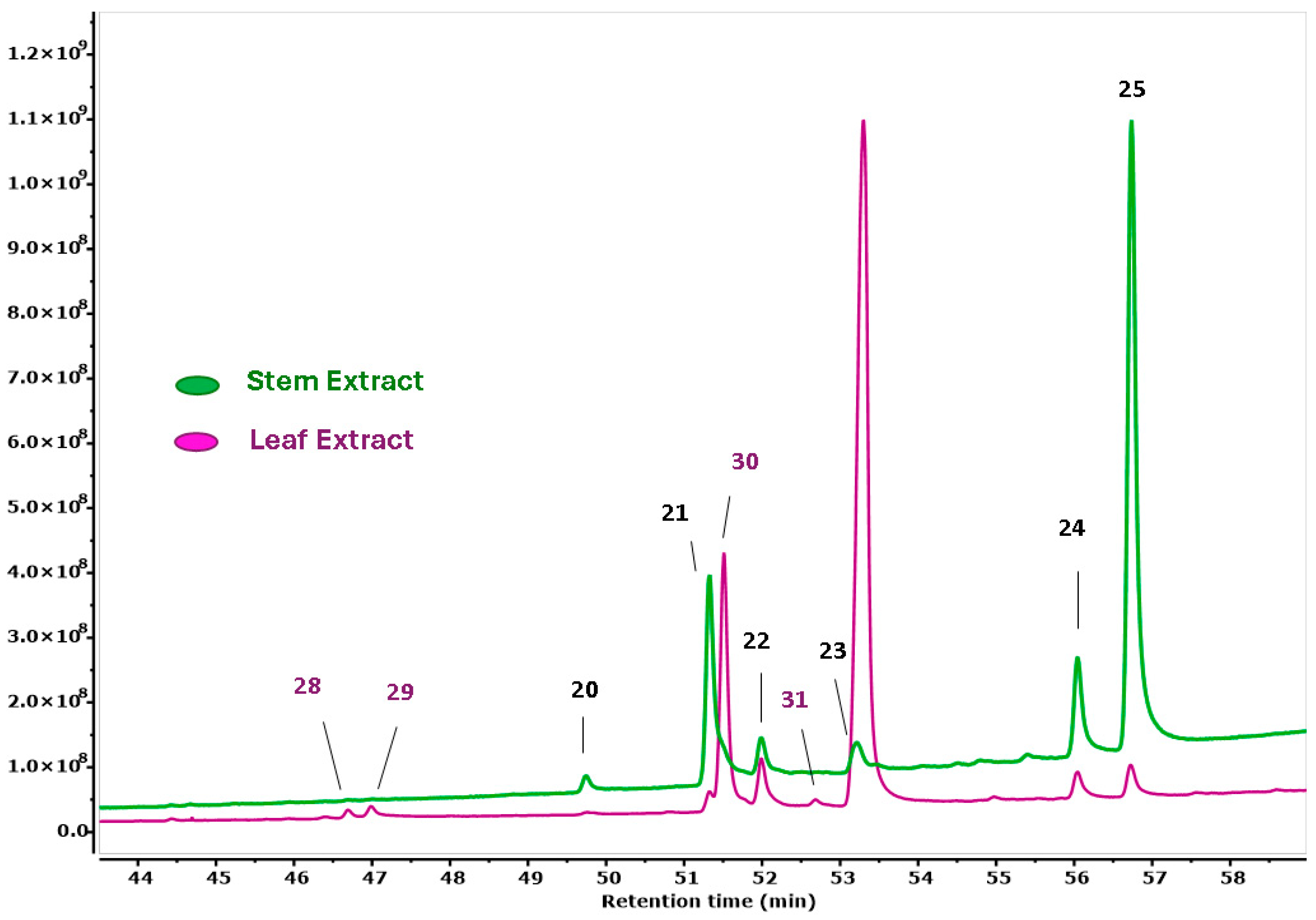 | 24 | 13,15-Octacosadiyne | 56.04 | 4.51 | 386.70 | C28H50 |