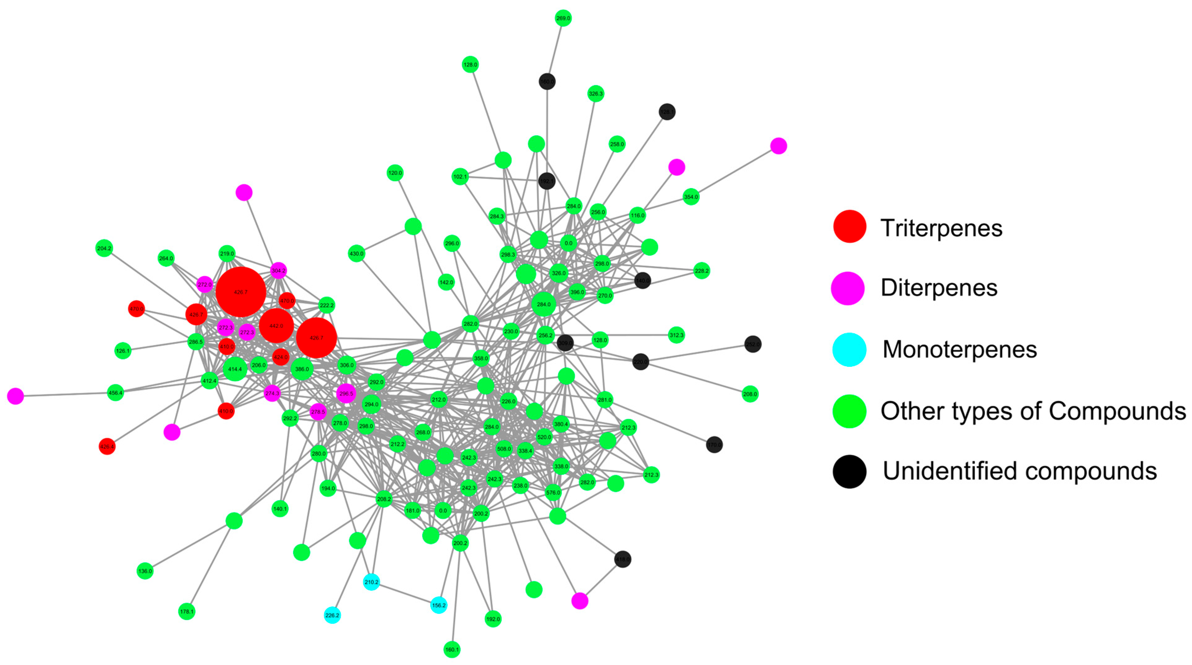 - Chérigo, L.; Fernández, J.; Martínez, R.; Martínez-Luis, S. Metabolomic Analysis Uncovers the Presence of Pimarenyl Cation-Derived Diterpenes as Insecticidal Constituents of Sphagneticola trilobata. Plants 2025, 14, 2219. [Google Scholar] [CrossRef]