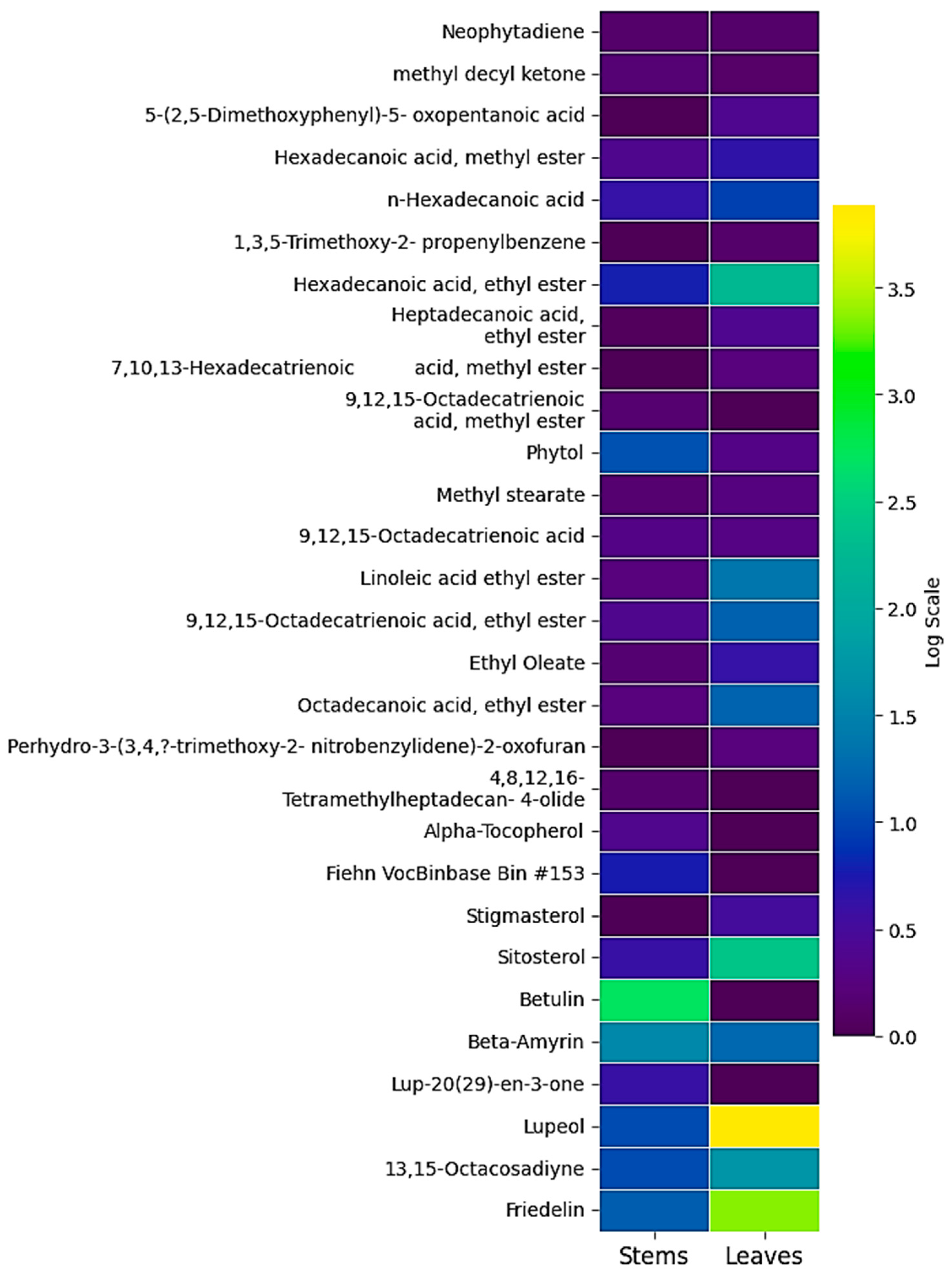 2.6. Heatmap of the Compounds Identified in the Leaf and Stem Extracts of Eschweilera jefensis