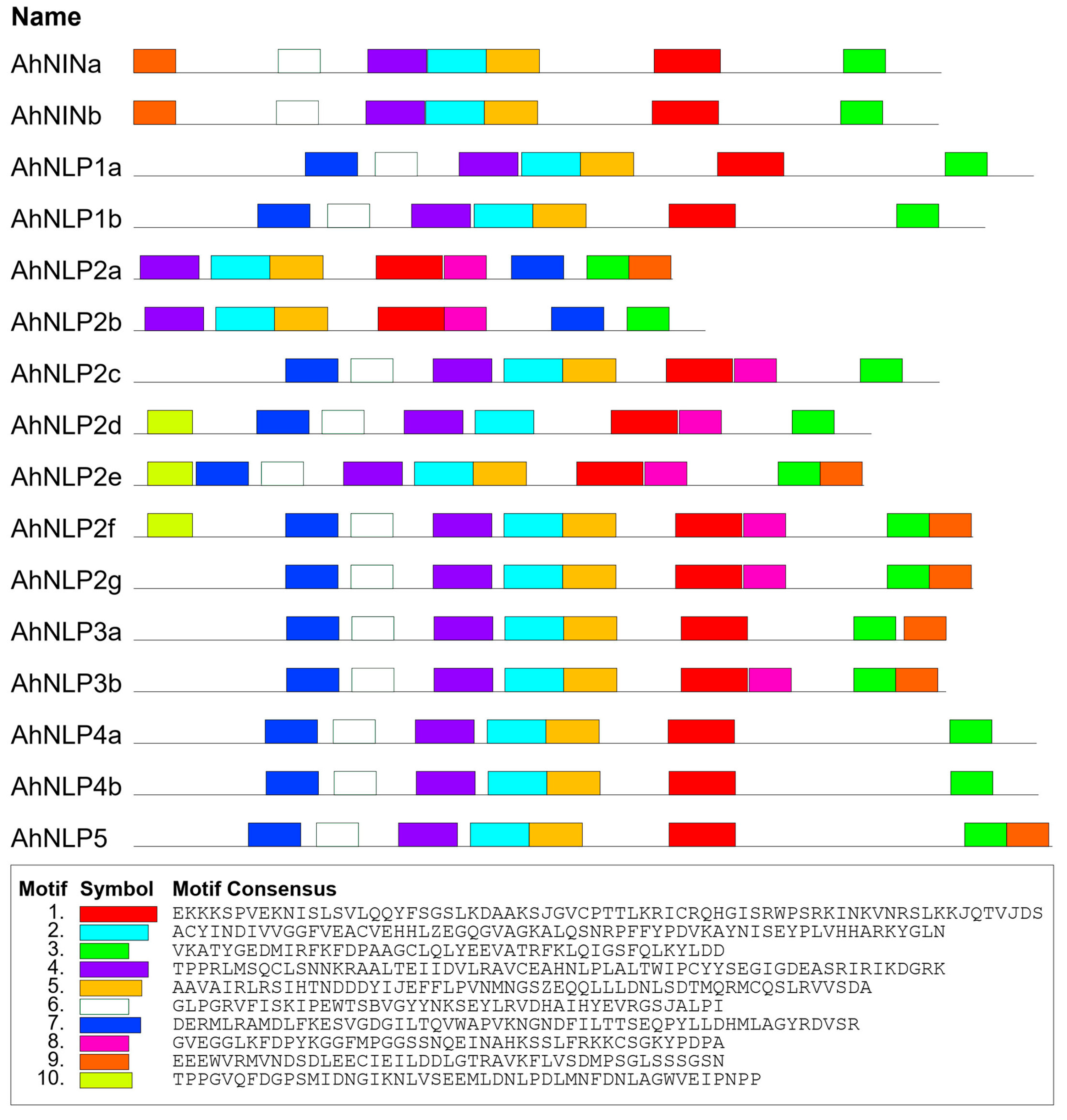 3.3. Conserved Motifs and Domains in AhNIN and AhNLP Proteins
