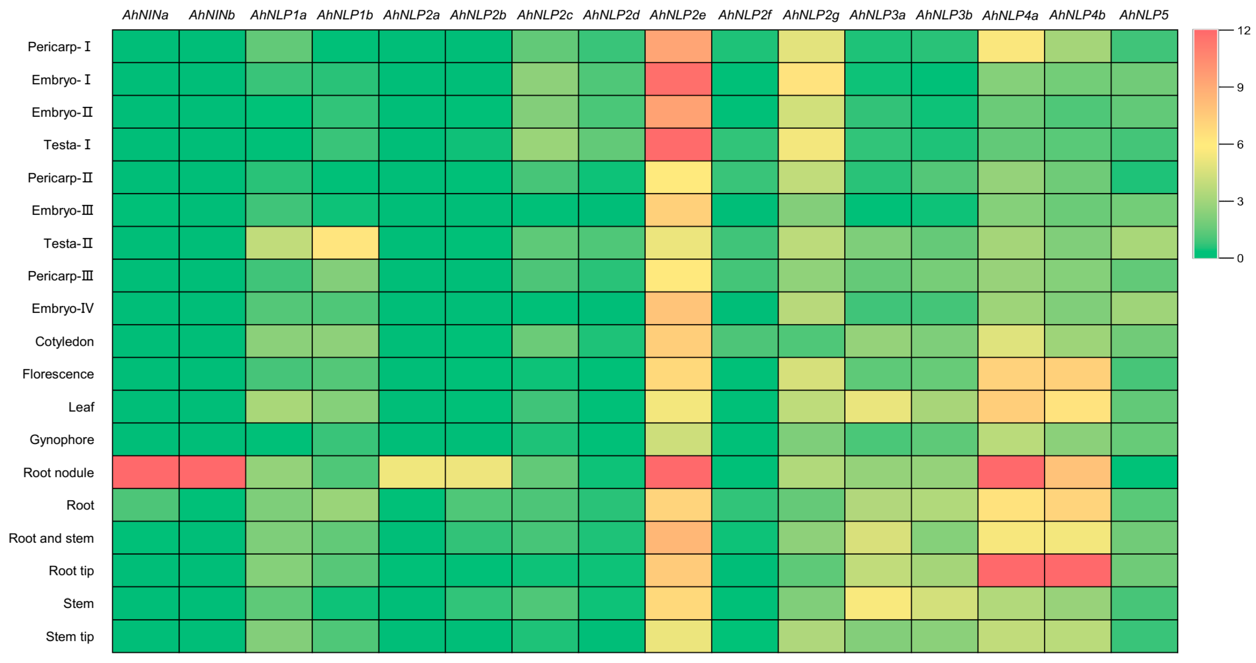 3.5. Expression Profiles of the AhNIN and AhNLP Genes