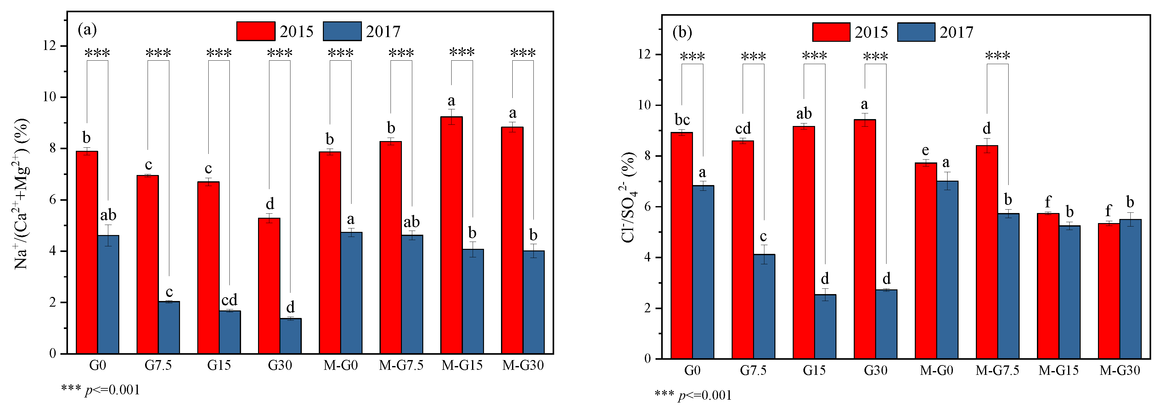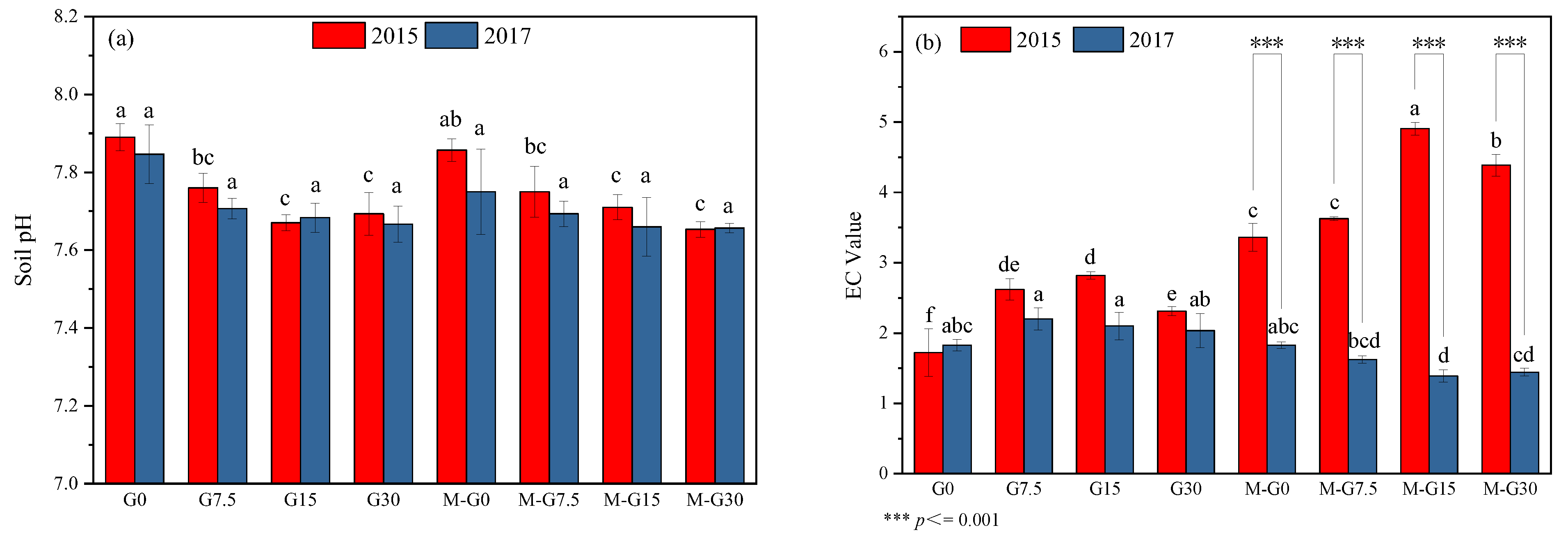3.2. Soil Chemical Properties’ Response to Gypsum and Manure Amendment