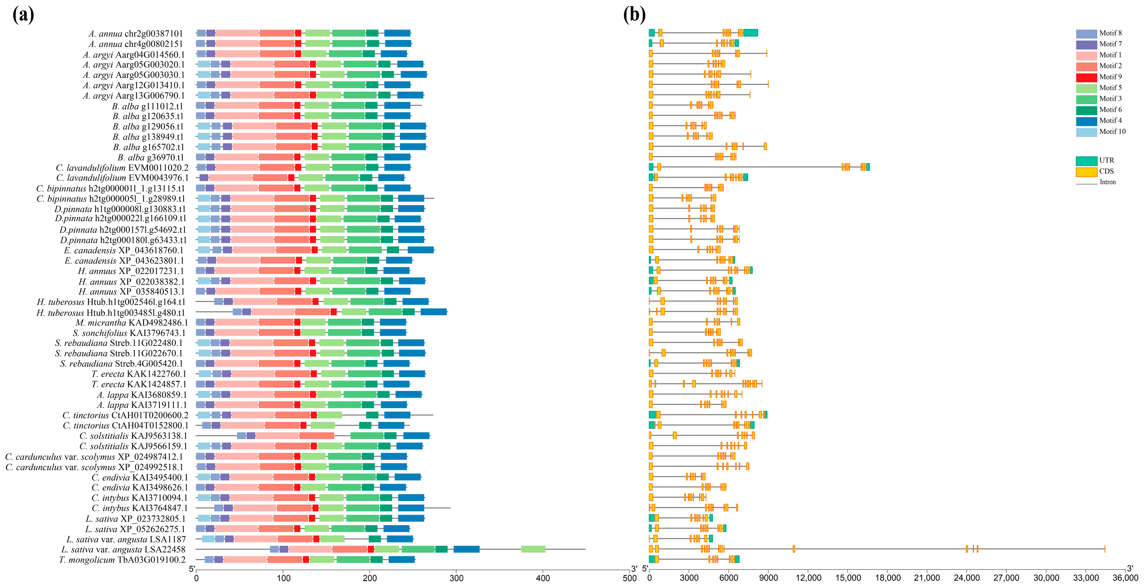 3.1. Genome-Wide Identification of AG Genes in Asteraceae