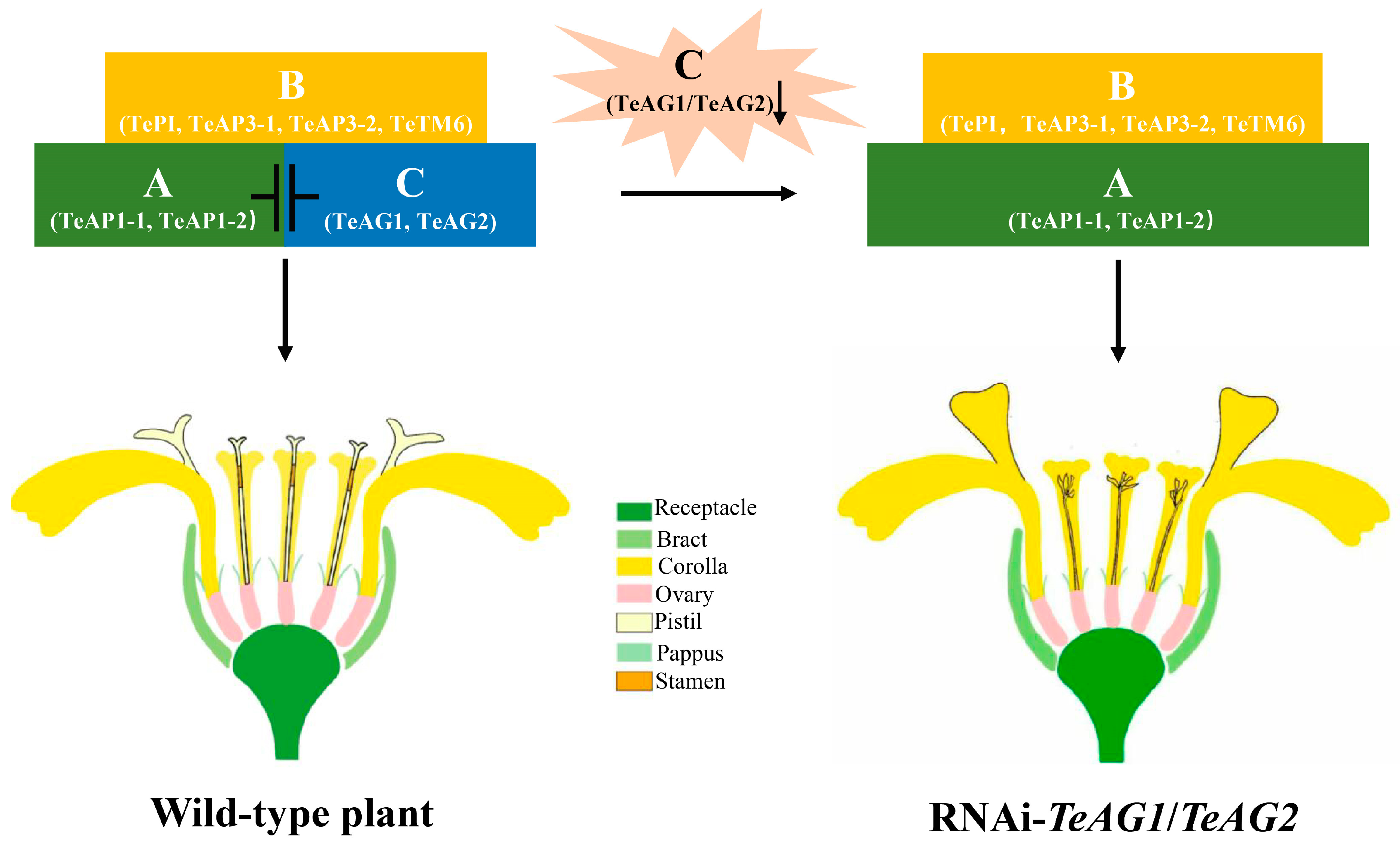 3.3. TeAG1 and TeAG2 Redundantly Affect Stamen and Pistil Development