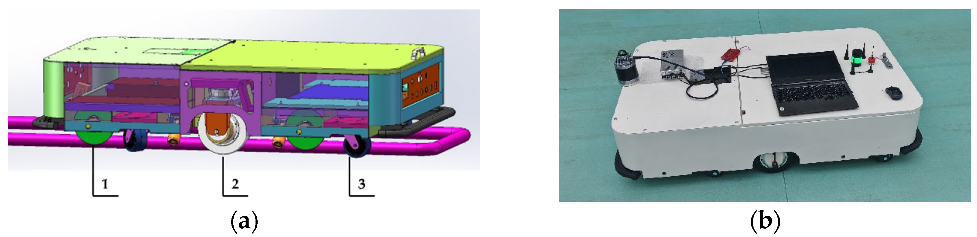 Figure 2. The chassis features a composite wheelset architecture that integrates an inner rail drive wheel, an outer ground drive wheel, and a top profile-tracking steering-suspension module. Each component is powered by an independent motor, enabling multimodal motion capabilities, including longitudinal travel, directional turning, and lateral rail-switching. Rail support wheel sets are mounted at the front and rear, while ground-mounted caster wheel assemblies provide additional support, ensuring stable load distribution and postural stability in both rail-running and ground-driving modes. Overall, the chassis maintains reliable ground maneuverability and leverages rail-imposed geometric constraints to enhance localization accuracy and trajectory tracking, providing a robust hardware platform for continuous cross-region operation in greenhouse environments.
