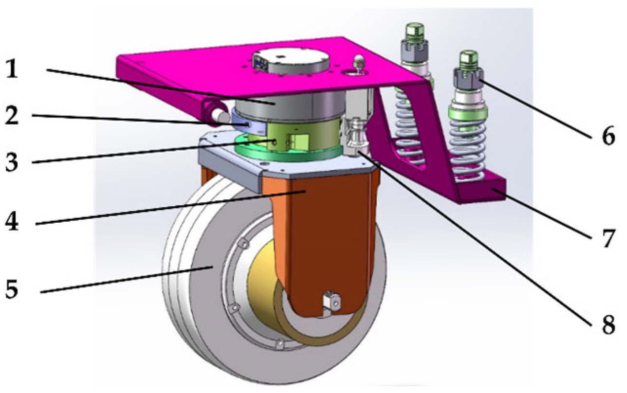 In greenhouse environments, mobile robots were subjected to impact loads when traversing dynamic terrains such as rail entry and exit, which induced postural disturbances and compromised tire-ground adhesion. To alleviate these effects, the drive-wheel connection plate was redesigned with integrated elastic elements, including springs and dampers, forming an energy-storing and shock-buffering linkage structure that absorbed impacts and attenuated vibrations during terrain transitions. Furthermore, to accommodate the lateral maneuverability required for inter-row operations, the chassis wheelset was equipped with a steering motor and a dedicated linkage mechanism, resulting in a wheel-rotation module that enabled efficient reorientation and lateral displacement on inter-row tracks, thereby reducing dependence on whole-vehicle steering during rail-switching maneuvers. Collectively, these enhancements markedly improved the robot’s stability and traversability under critical conditions, including cross-track transitions and inter-row lateral maneuvers. The design of the enhanced profile-tracking steering-suspension module is illustrated in