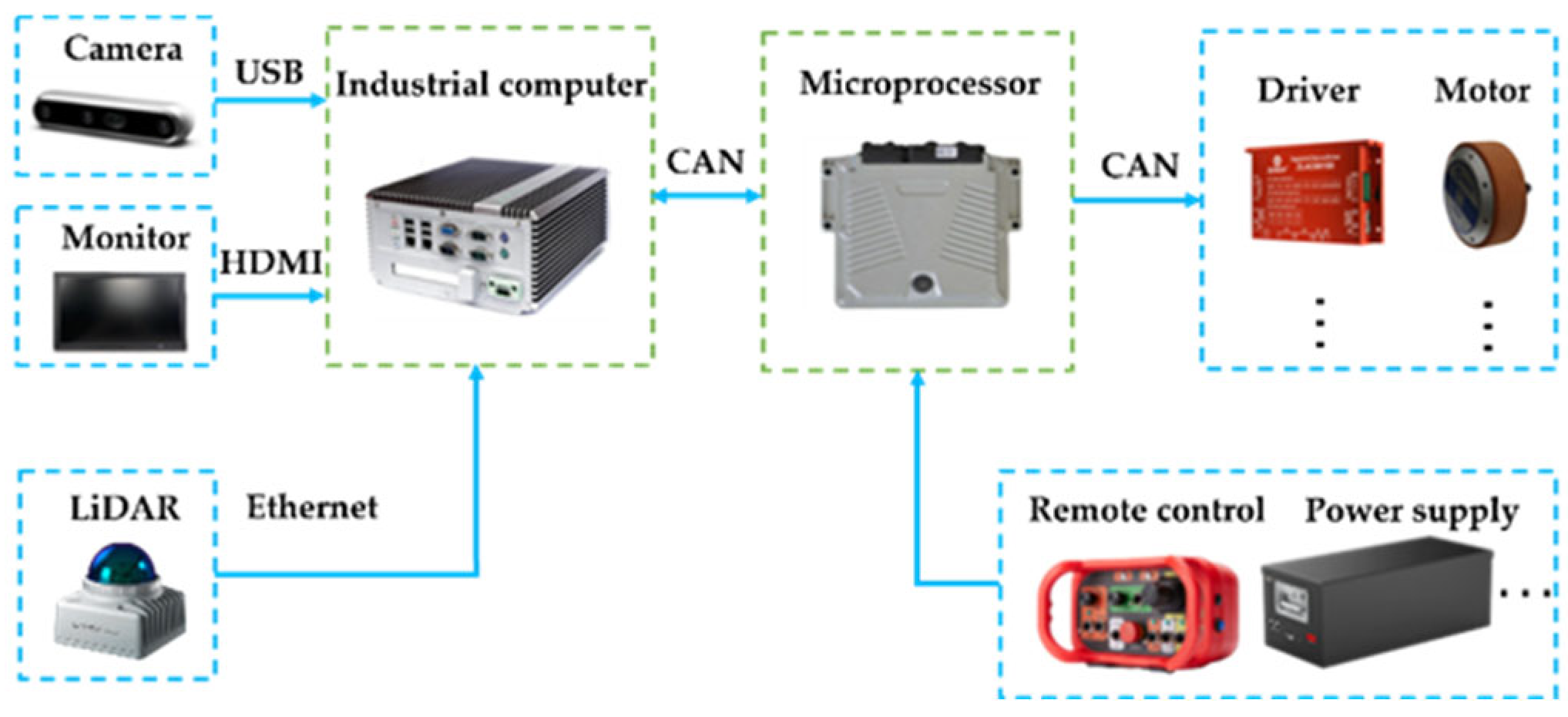 Considering overall performance and economy, this study utilizes a solid-state LiDAR (model Mid-360; Livox, Shenzhen, China) as the primary perception unit for map construction in greenhouse environments. Compared to mechanically scanned LiDARs, this sensor affords low cost, a compact footprint, and high responsiveness, while also supporting Ethernet-based direct interfacing with an Industrial Personal Computer (IPC) to enable time-synchronized acquisition and output of point-cloud data and measurements from the integrated IMU. In parallel, rail identification is carried out using a D415 depth camera (model RealSense D415; Intel Corporation, Santa Clara, CA, USA) to capture structured visual (RGB-D) information. Sensor streams are processed on the IPC to generate target waypoints and trajectory commands, which are transmitted to the low-level controller. At the chassis level, a suspension-drive mechanism is employed to handle mixed rail or ground conditions. A geared DC motor drives longitudinal motion, while a servo motor is used for steering and postural adjustments. The IPC functions as the core control unit, managing real-time multi-sensor data acquisition and timestamp synchronization, environment mapping, rail detection algorithms, motion planning, command dissemination, and system-state monitoring. The overall control architecture is shown in