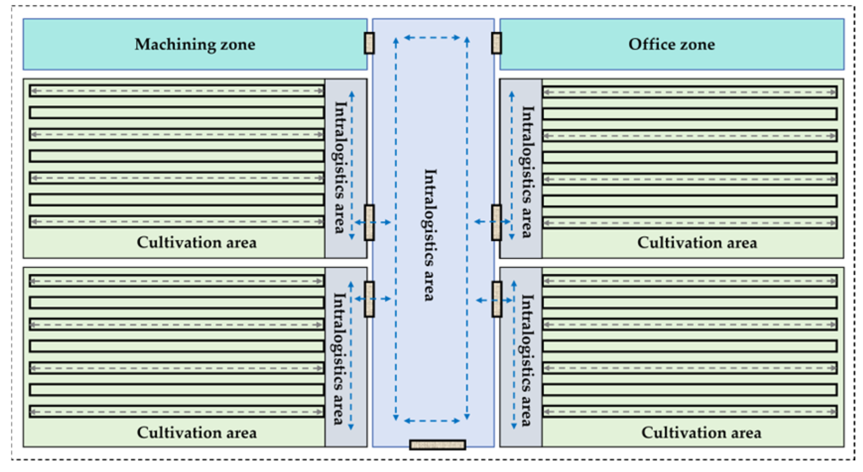 Figure 1, contemporary multi-span greenhouses are organized into two core functional areas that collectively support high-efficiency facility-agriculture workflows: the intralogistics area, typically aligned with glass curtain walls, serves as the hub for material flow and operational scheduling, covering tasks such as the transfer of production inputs and harvested products, as well as non-cultivation activities like transport, loading, unloading, and sorting. The cultivation area forms the main spatial component, equipped with crop-production installations and work aisles. This area is coupled with integrated environmental control systems that maintain optimal microclimatic conditions, ensuring stable production and high quality. Together, these two partitions are complementary and synergistic, forming a complete operational system that enables continuous and standardized greenhouse production.