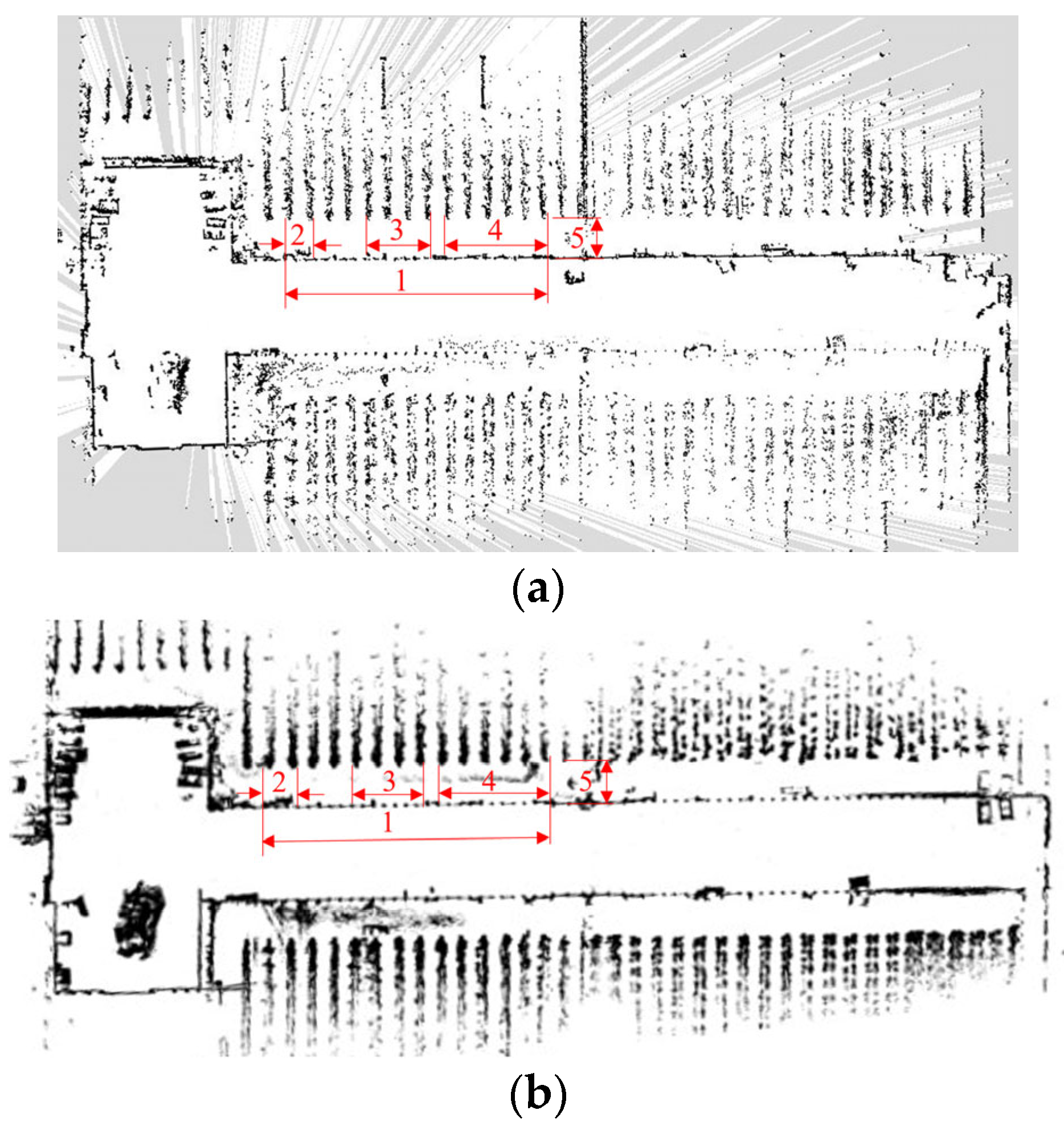 Figure 10). The maps also exhibit extended spatial coverage, capturing the principal structural elements and spatial organization of the multi-span greenhouse. In highly repetitive greenhouse structures, the optimized LIO-SAM demonstrates enhanced robustness and environmental adaptability. Compared with 2D mapping methods, 3D LiDAR SLAM point-cloud maps offer higher spatial resolution and richer detail, enabling precise estimates of inter-row spacing, trellis height, obstacle volumes, and clearances. These properties yield a more reliable environmental representation to support path planning, obstacle avoidance, and operational decision-making in complex agricultural tasks.