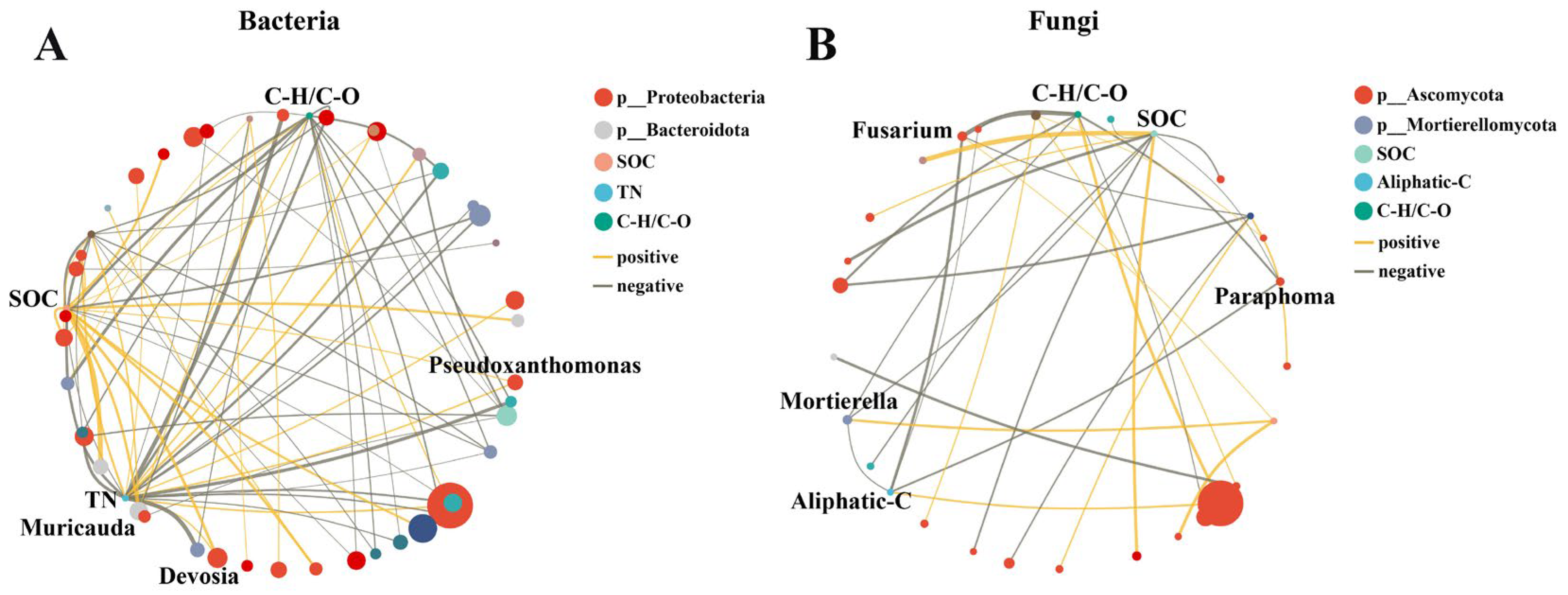 - Xiao, D.; He, X.Y.; Wang, G.H.; Xu, X.C.; Hu, Y.J.; Chen, X.B.; Zhang, W.; Su, Y.R.; Wang, K.L.; Soromotin, A.V.; et al. Network analysis reveals bacterial and fungal keystone taxa involved in straw and soil organic matter mineralization. Appl. Soil Ecol. 2022, 173, 104395. [Google Scholar] [CrossRef]