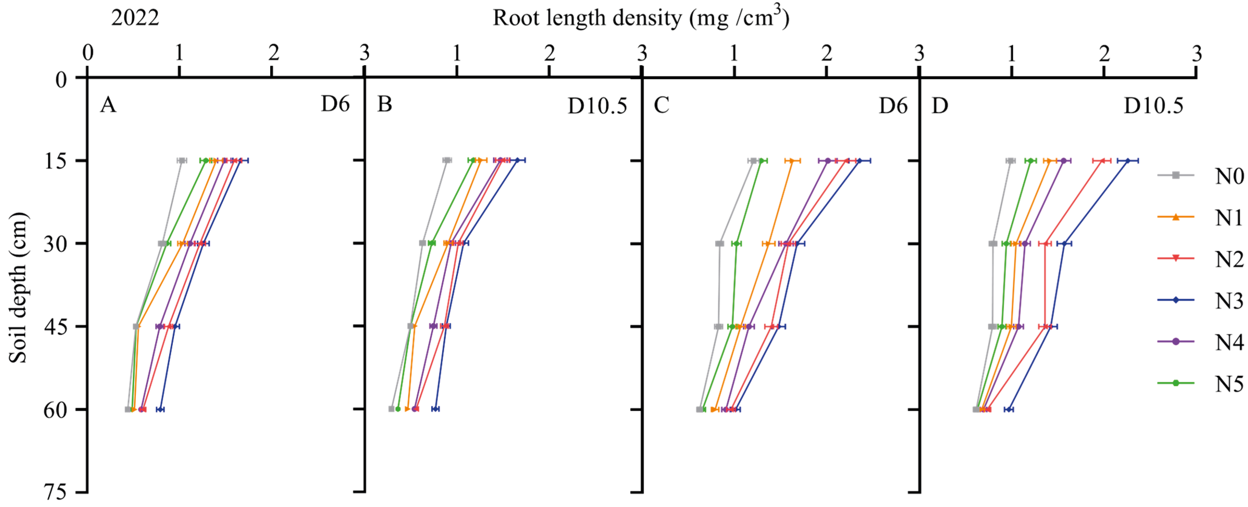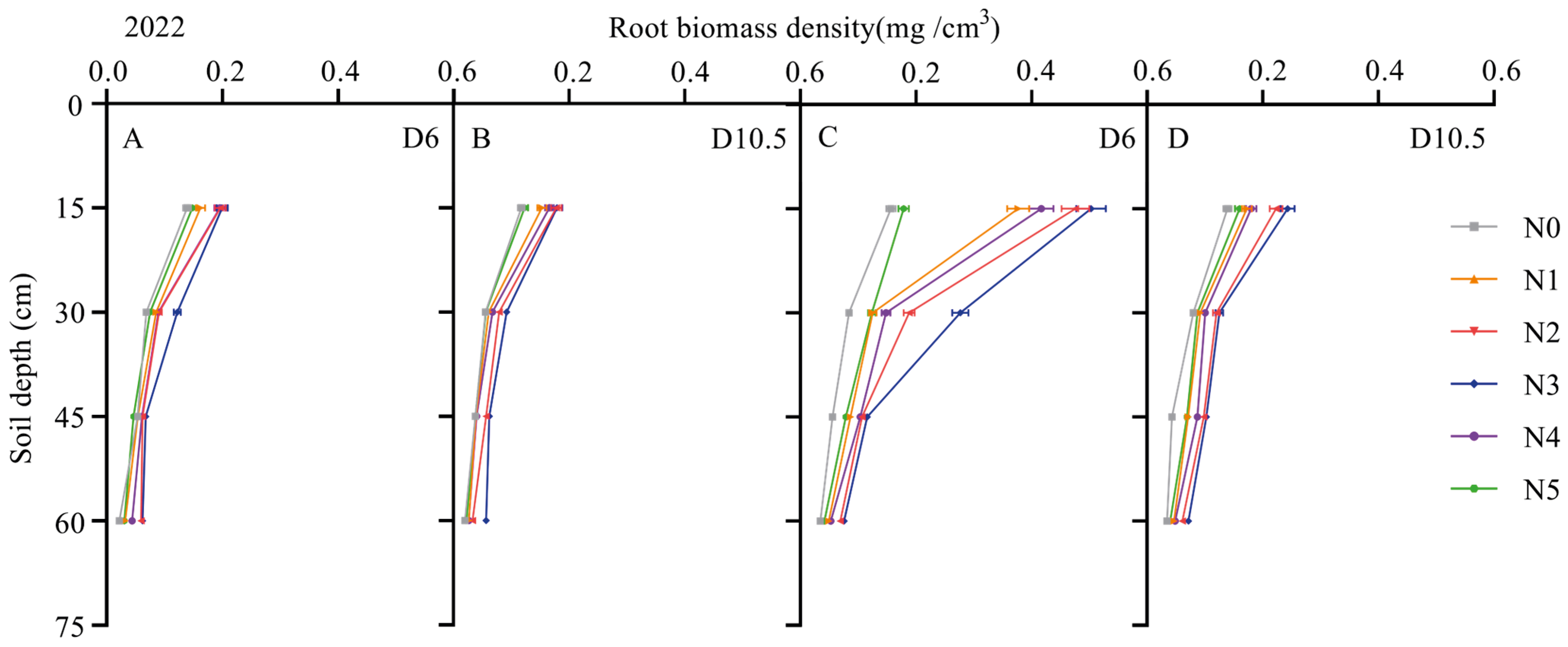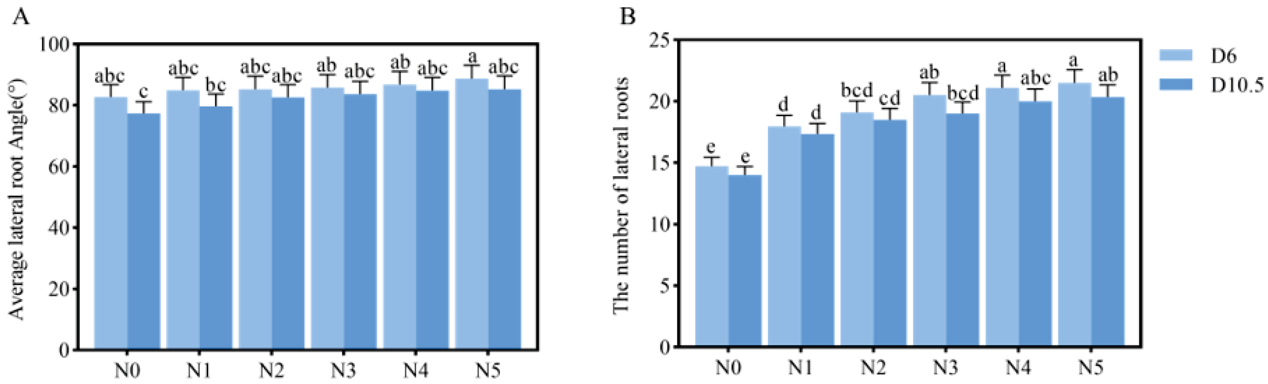 D6 × N1 | 6.28 ± 0.31 b | 6.22 ± 0.31 bc | 54.25 ± 1.10 b | 51.46 ± 2.78 b |