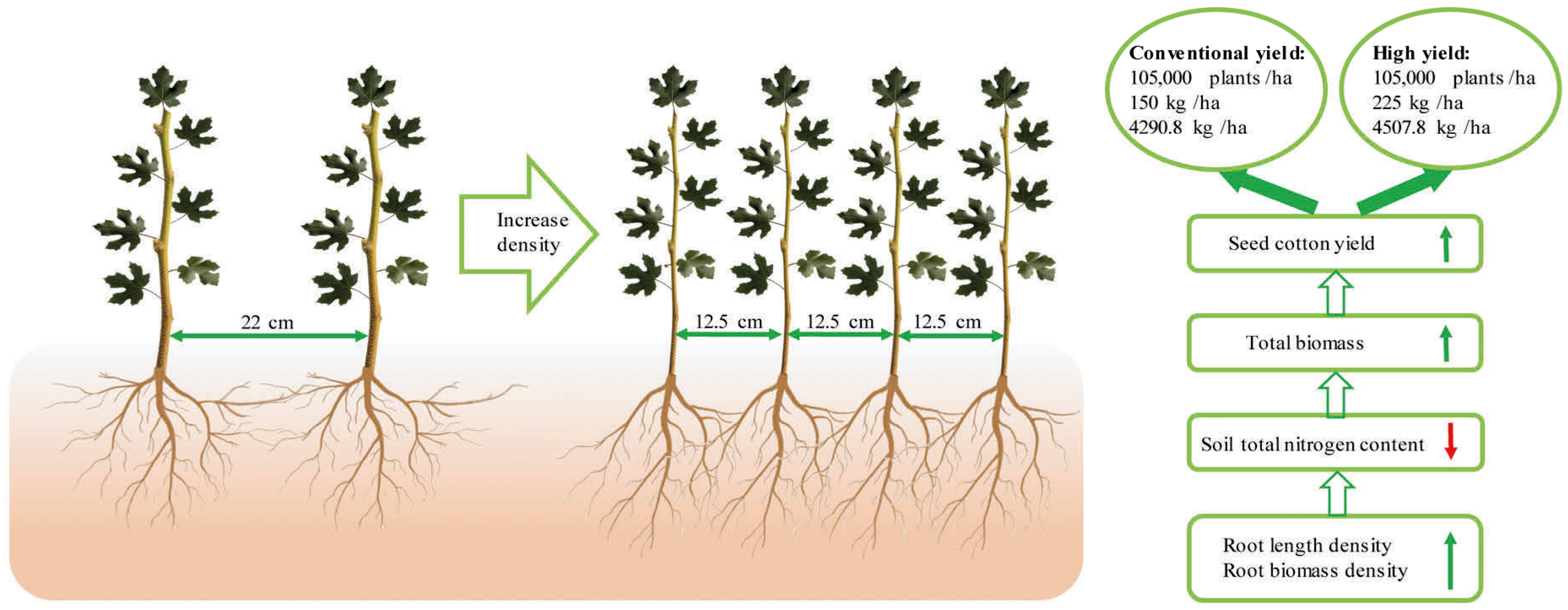 Liu J, Ma Y, Wang S, Wang S, Zhu L, Zhang K, Zhang Y, Li C, Liu L, Sun H. Synergistic Optimization of Root–Shoot Characteristics, Nitrogen Use Efficiency and Yield by Combining Planting Density with Nitrogen Level in Cotton (Gossypium hirsutum L.). Agronomy. 2025; 15(10):2383. https://doi.org/10.3390/agronomy15102383