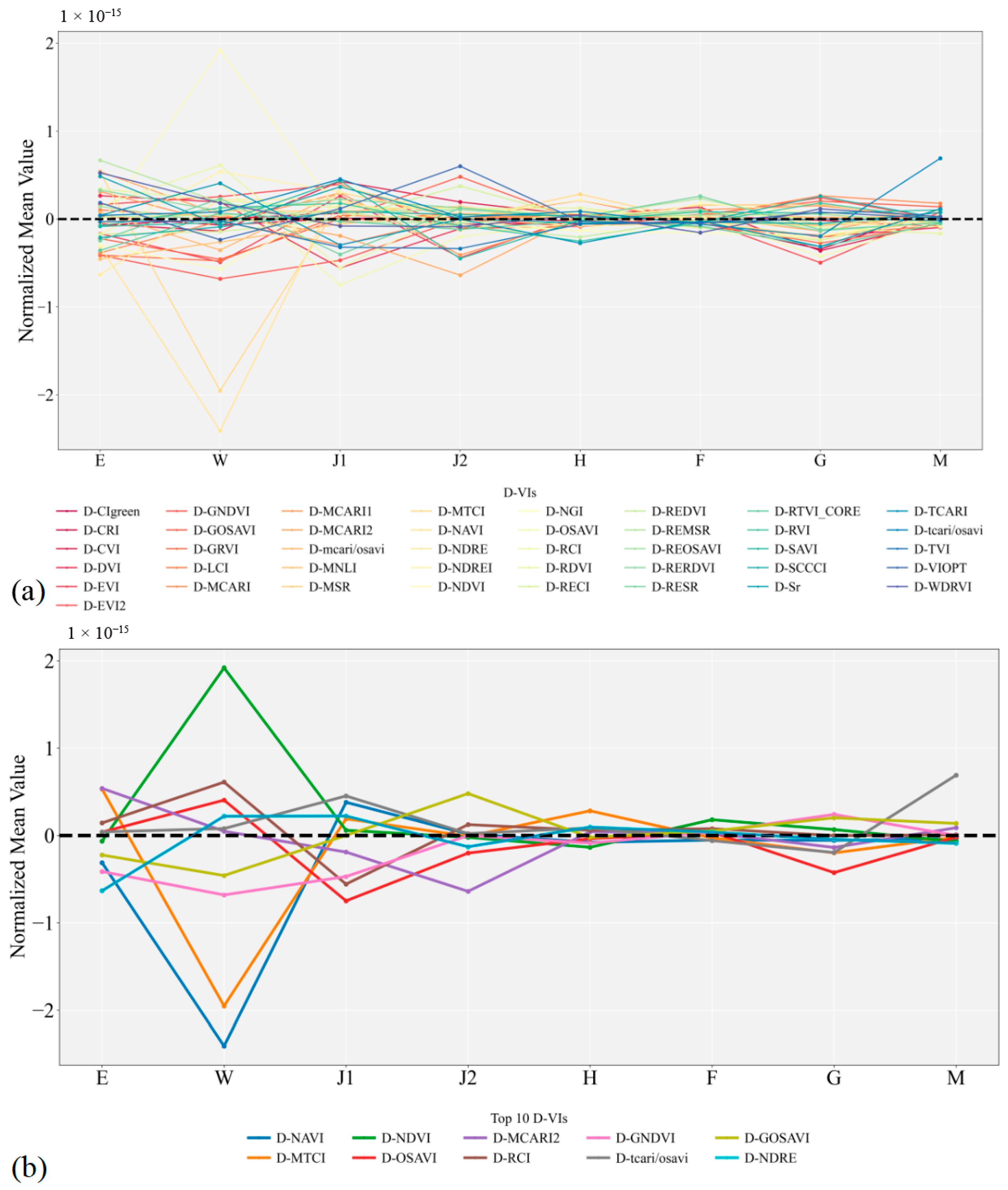 | M | D-CVI (0.0337), D-GRVI (0.0443), D-MCARI (0.0305), D-MSR (0.0336), D-MTCI (0.0368), D-NAVI (0.0346), D-NDREI (0.0334), D-NDVI (0.0323), D-OSAVI (0.0346), D-REOSAVI (0.0309), D-Sr (0.0404), D-TCARI (0.0306), D-WDRVI (0.0319) |