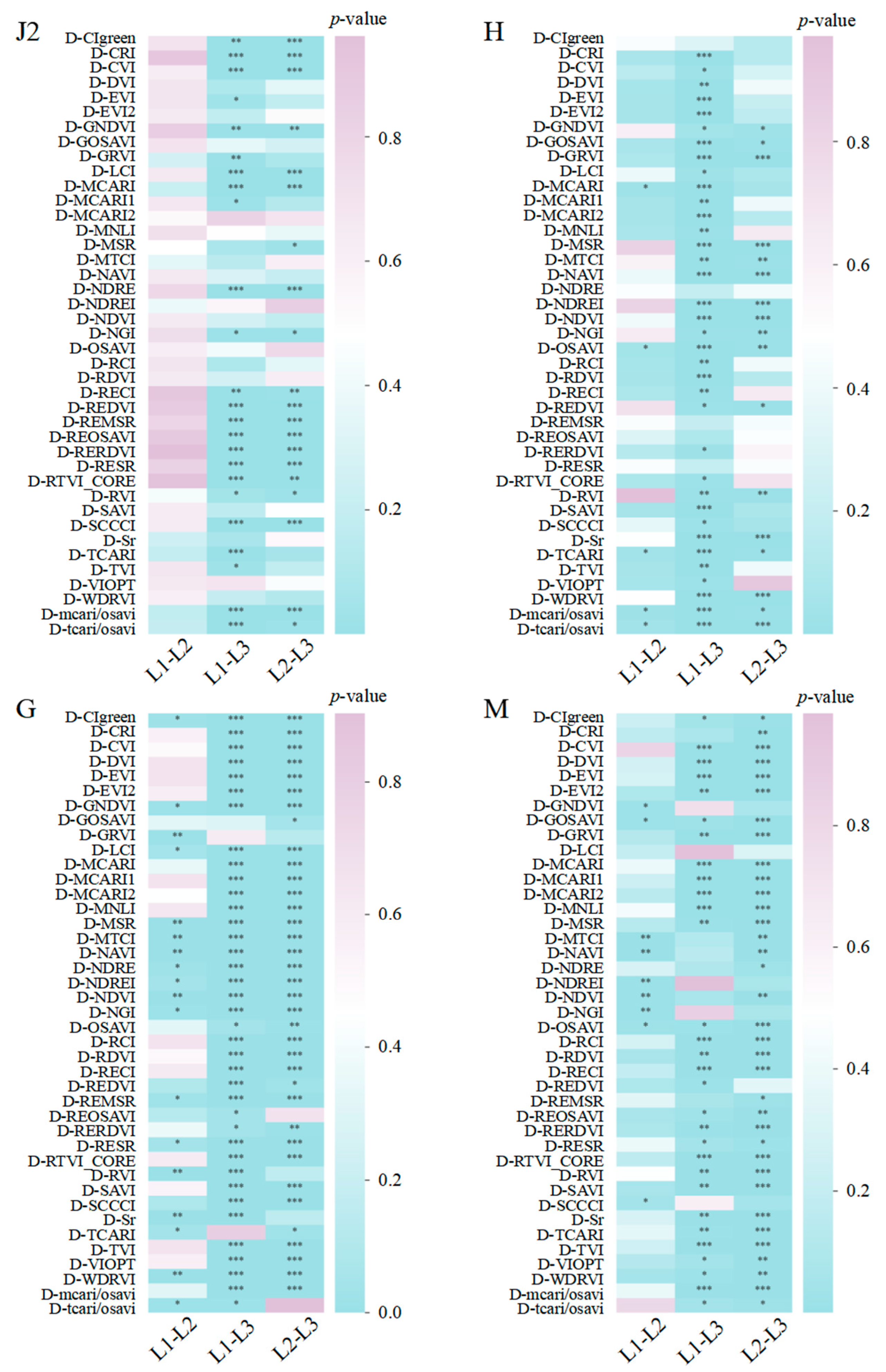 | G | D-CVI (0.0347), D-GNDVI (0.0317), D-NAVI (0.0474), D-NDREI (0.0403), D-NDVI (0.0538), D-NGI (0.0525), D-Sr (0.0335), D-WDRVI (0.0363) |