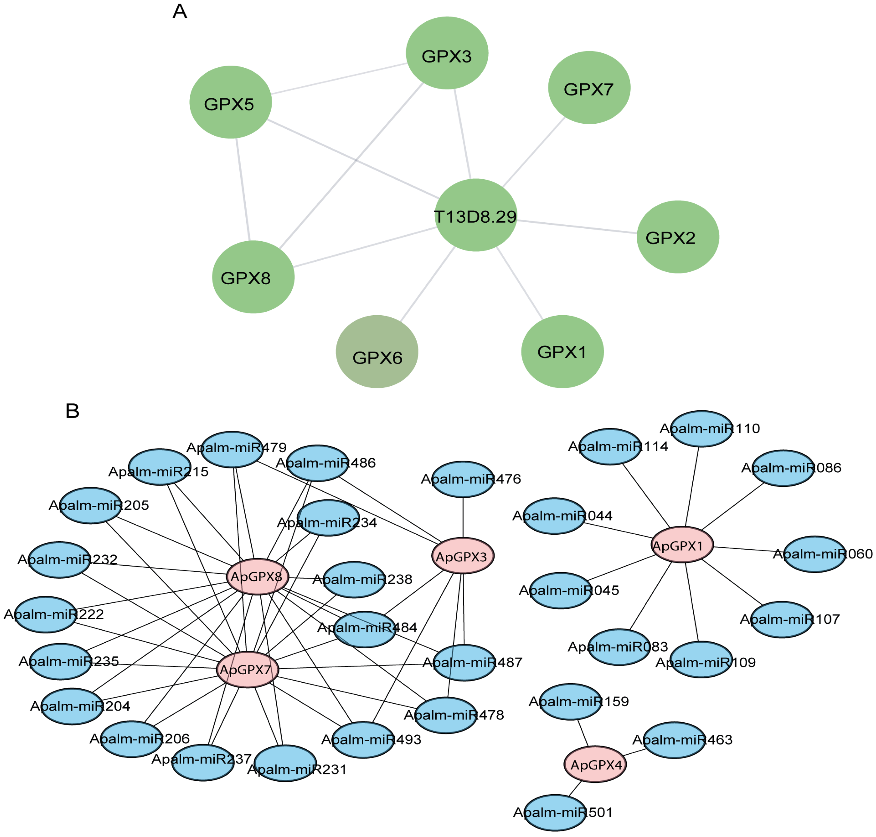 2.7. Prediction of miRNA-ApGPXs and Protein–Protein Interaction (PPI) Network