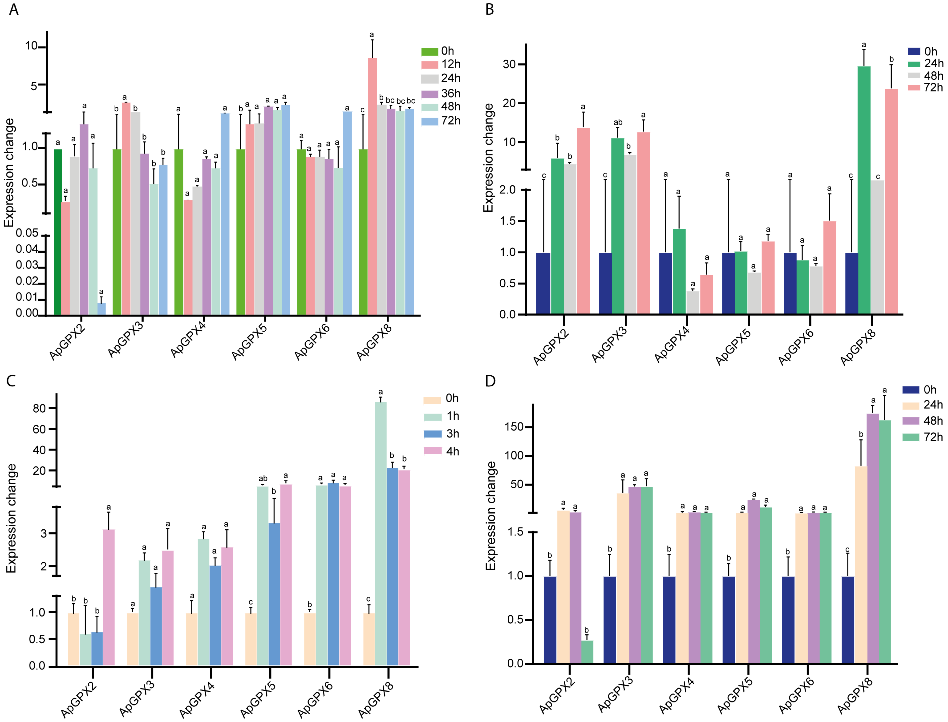 3.8. Transcriptional Responses of the ApGPXs Under Different Treatments